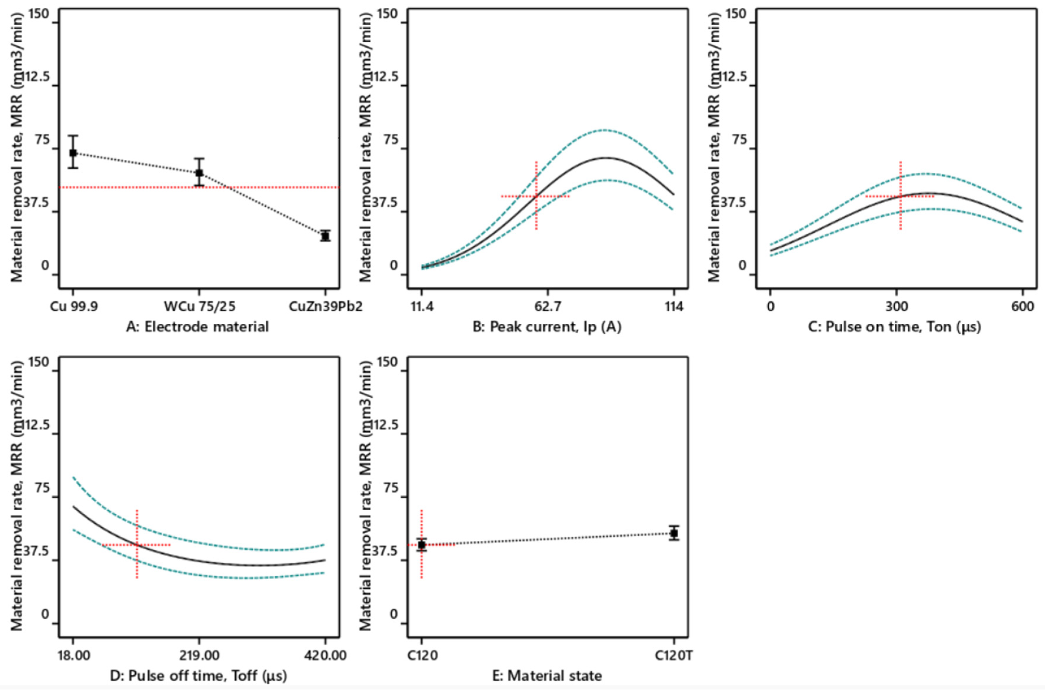 - The peak current effect on MRR is much more pronounced when machining with Cu 99.9 and Wcu 75/25 electrodes compared to the brass electrode CuZN39Pb2 when using a peak current of 114 A (Figure 5c). For low values of Ip, MRR values are not differentiated by the type of electrode material. Furthermore, for all variation curves, regardless of the electrode used, a maximum point is observed around 90 A, after which the peak-current effect on MRR is negative (Figure 5d).