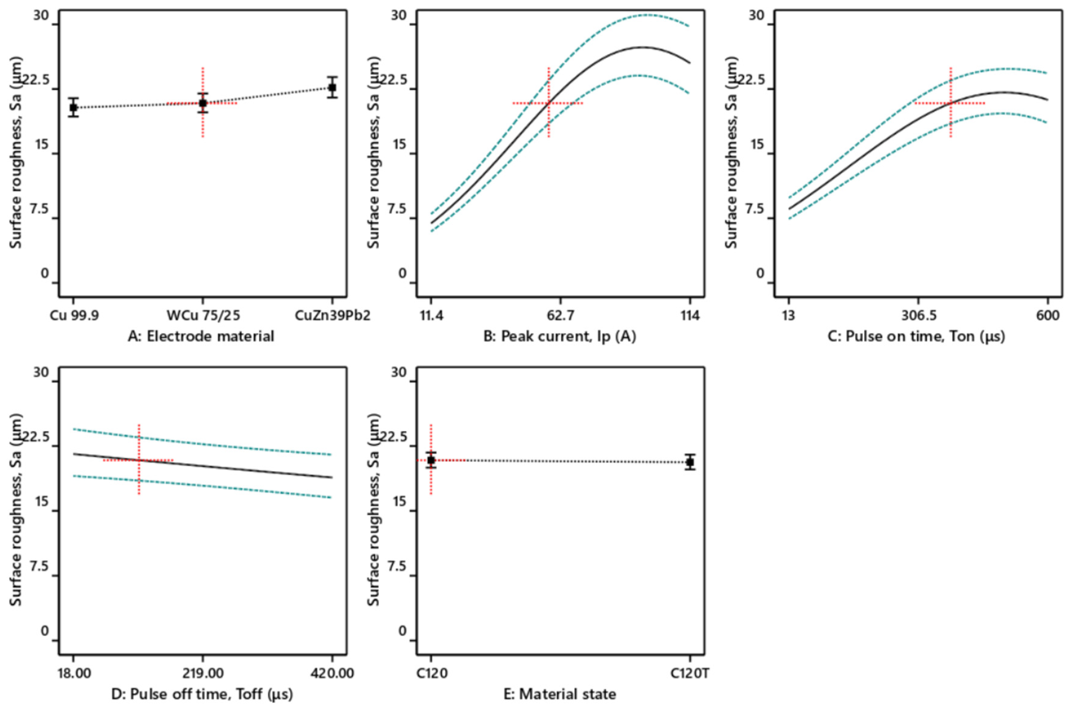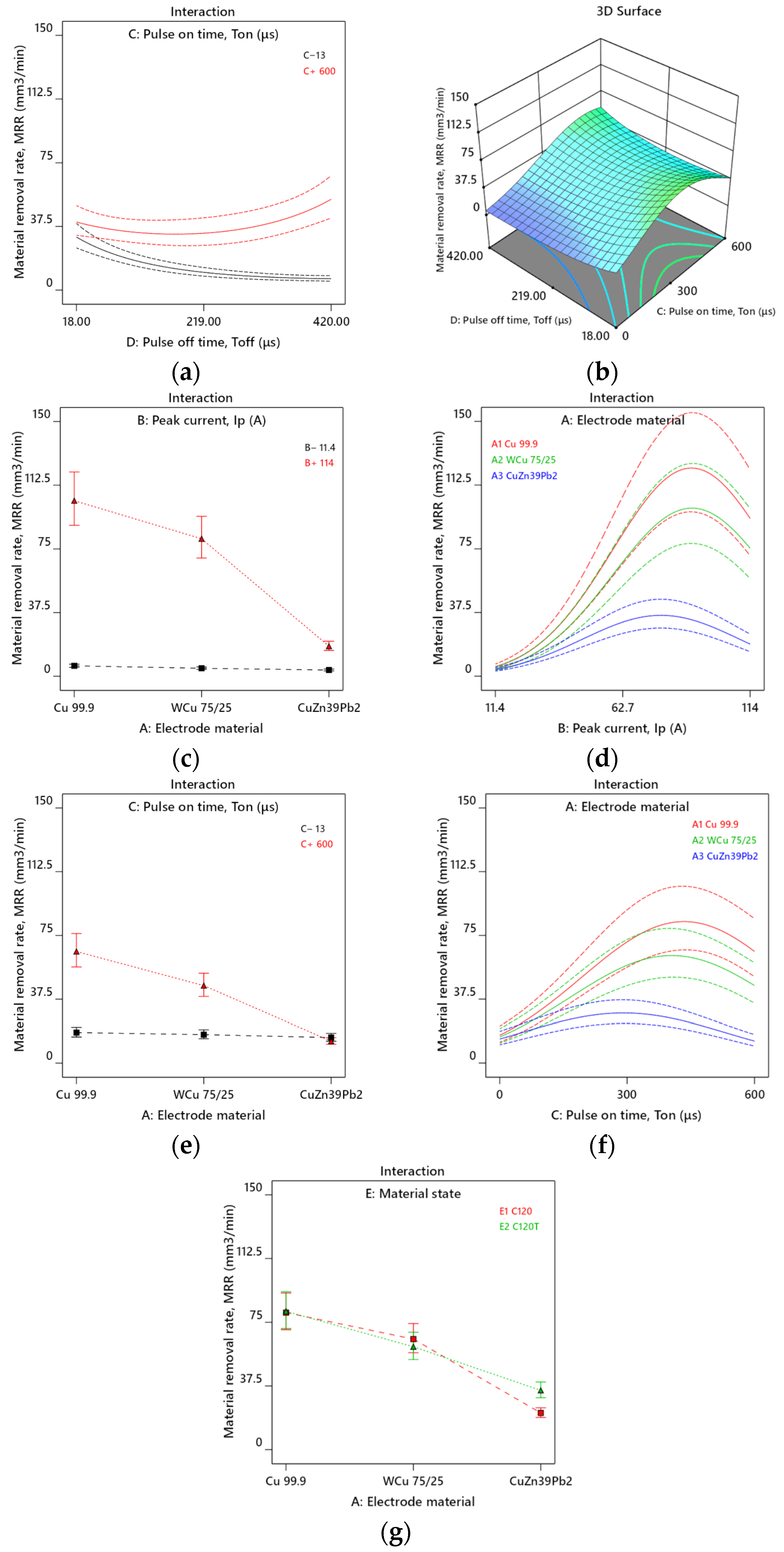 - The interaction AC reveals that for the lower Ton, the electrode material does not modify surface roughness. However, for larger Ton (600 μs), the surface roughness is significantly higher and increases from the Cu 99.9 electrode to Wcu 75/25 and CuZn39Pb2 (Figure 7e).