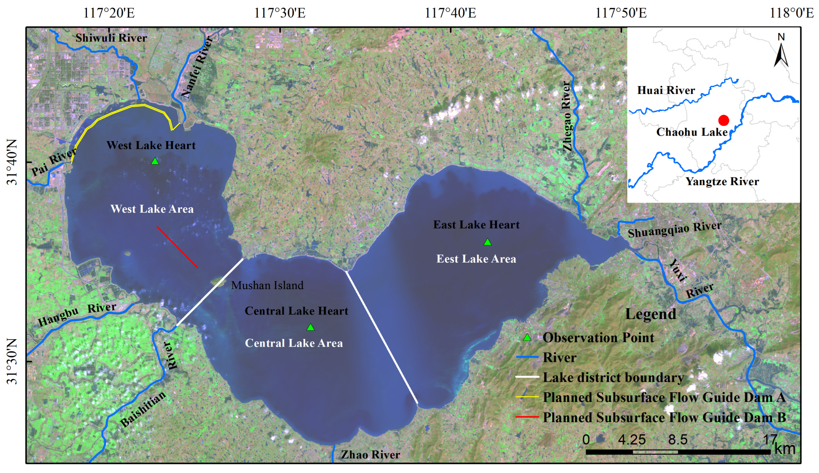 - Wang, Y.; Liu, G.; Zhu, S.; Hu, W.; Zhang, H.; Zhou, X.; Peng, Z. Assessment of impacts of water transfer on lake flow and water quality in Lake Chaohu using a three-dimensional hydrodynamic-ecological model. J. Hydrol. Reg. Stud. 2023, 46, 101333. [Google Scholar] [CrossRef]