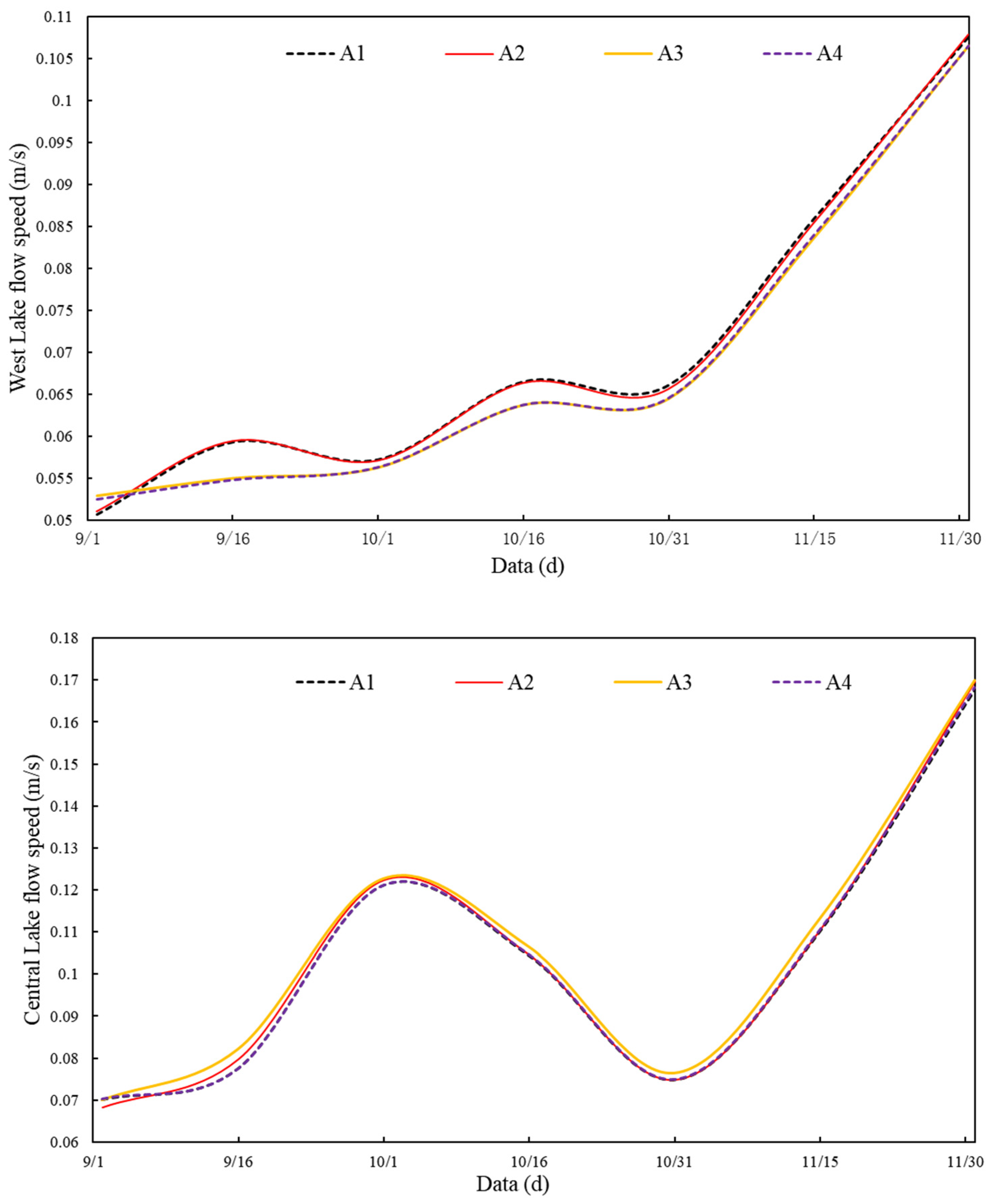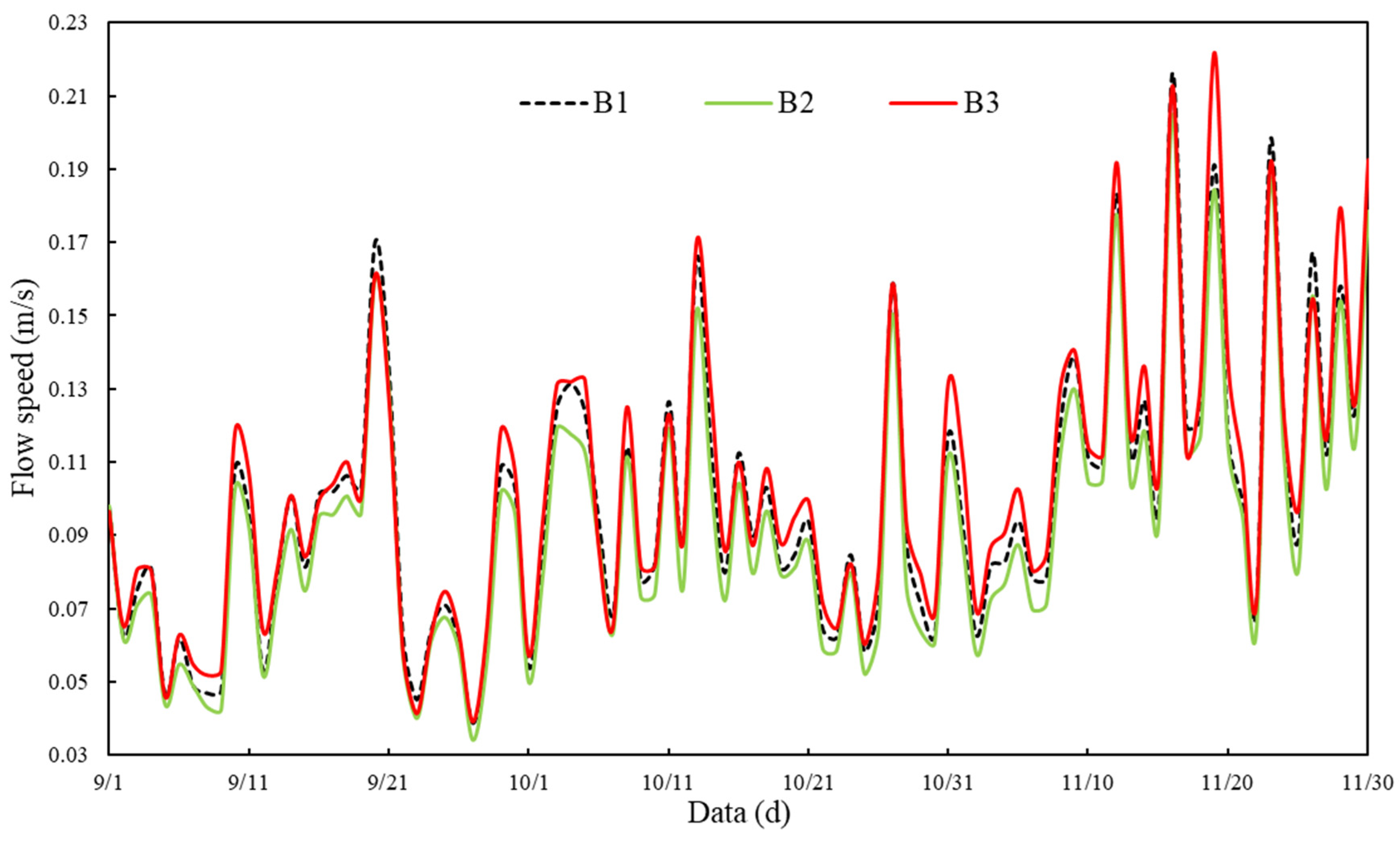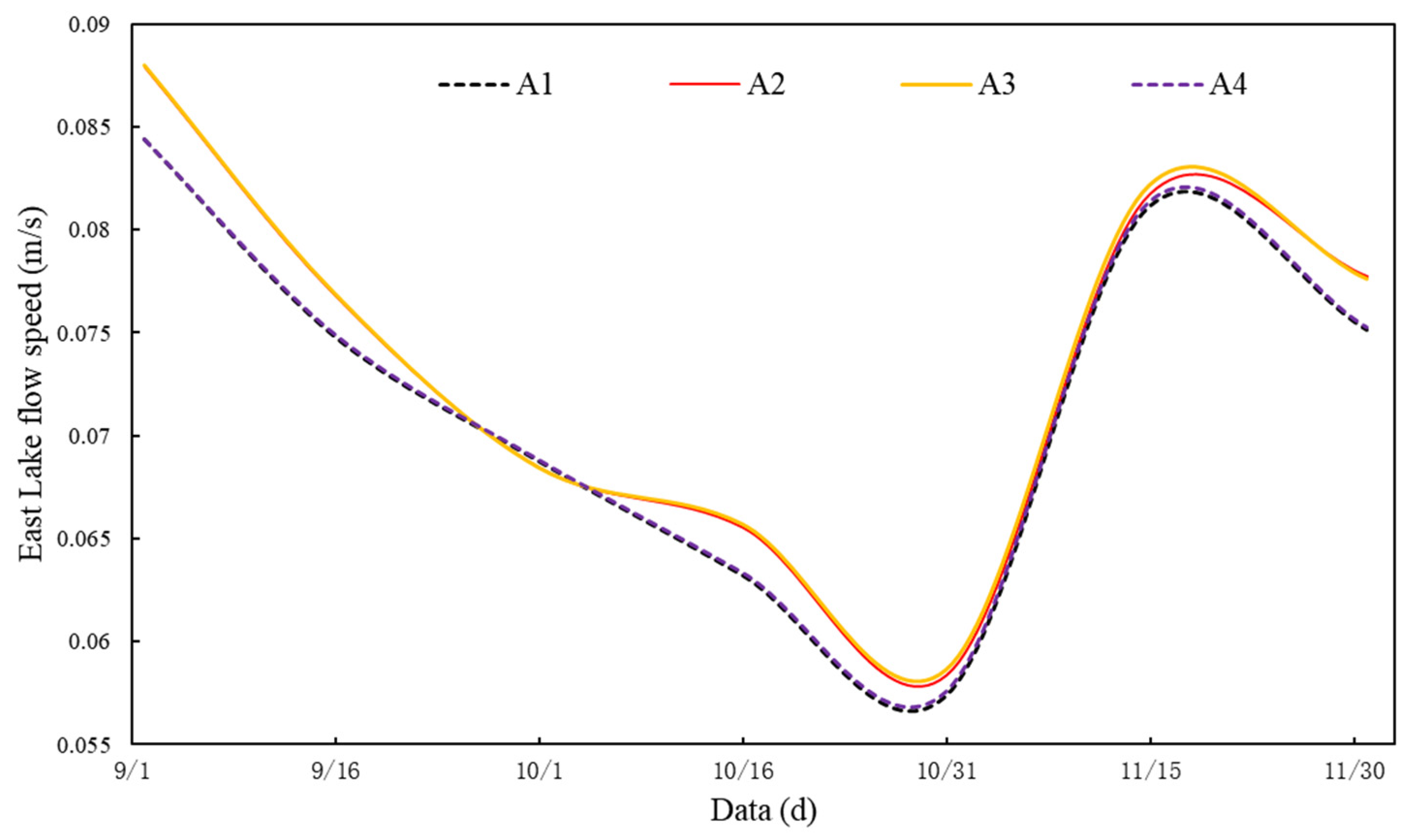 3.3.2. Changes in Hydraulic Retention Time and Flow Velocity in the West Lake
