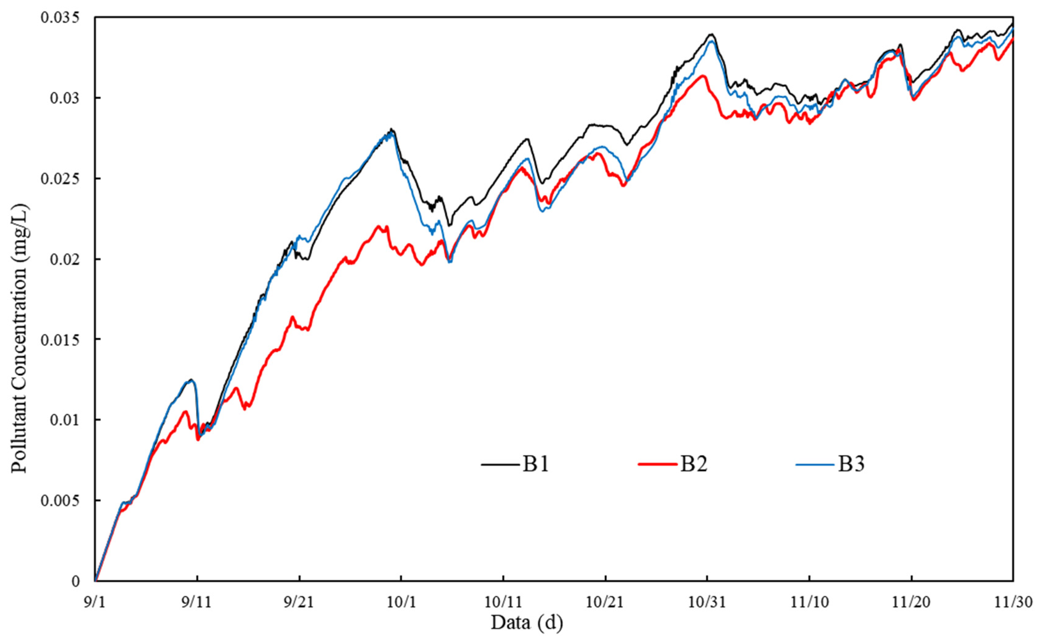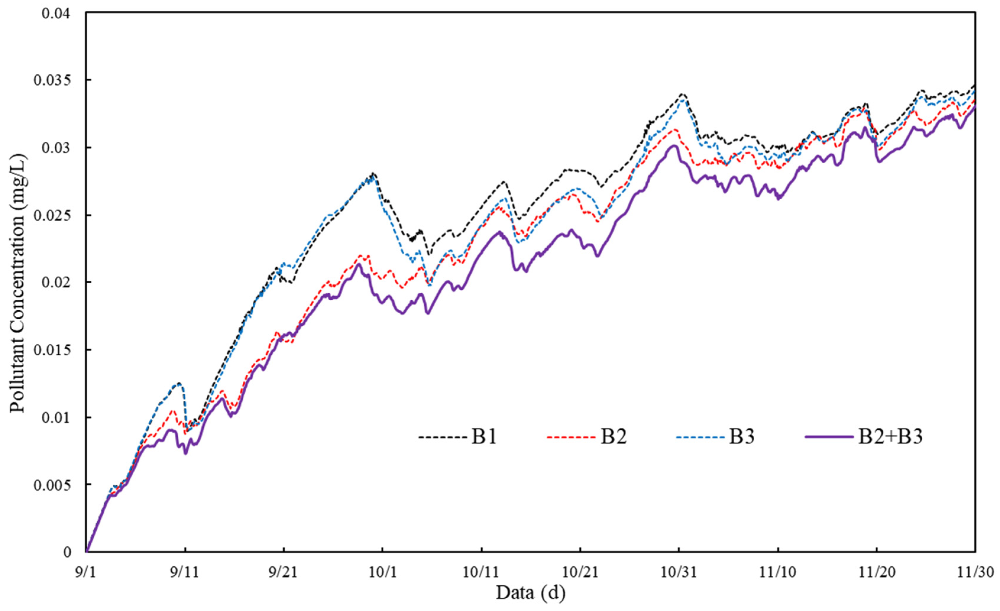 3.3. Impact of Subsurface Flow Guide Dam Layout in the West Lake Area on the Migration of Heavily Polluted Water