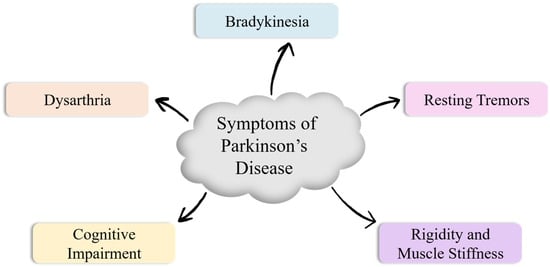 Parkinson’s disease (PD) is a common progressive (age-dependent) neurodegenerative condition that affects approximately 2–3% of people older than 65 years by affecting the dopaminergic neurons in the substantia nigra pars compacta [1]. This multisystemic disease is characterized by neuronal loss, which causes parkinsonism and non-motor symptoms, like hallucinations, hyposmia, dementia, and sleep disorders [2]. The loss of Dopamine in PD, along with low norepinephrine levels [3], causes multiple symptoms like bradykinesia (slow movements) [4], tremors [5], dysarthria (motor speech disorder) [6], rigidity [7], and cognitive impairments [8] in patients, as depicted in Figure 1. The clinical presentation varies substantially across individuals, and symptoms worsen gradually over time, although pharmacological and rehabilitative therapies can alleviate disease burden to some extent.