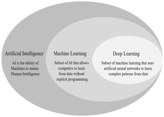 Deep learning (DL) is a subfield of Machine Learning (ML), as shown in Figure 2, which utilizes hierarchical artificial neural networks to unlock complex patterns within the data [20]. This capability makes it helpful in fields like natural language processing and computer vision. DL stands out from ML for its brain-like architecture and the ability to automatically extract patterns from data, unlike traditional methods that rely on human-defined features [21].