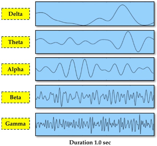 PD is associated with a slowing of brain activity (cortical activity), characterized by a shift from alpha to slower theta and delta brainwaves, even in early stages, along with a decrease in higher frequency activity [14]. Electroencephalography (EEG) signals effectively detect Parkinson’s disease despite their low amplitude, but their manual analysis is tedious and time-consuming. A visualization of different waves is presented in Figure 3 [22].