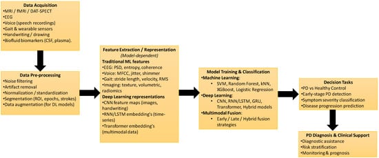 Section 2.1, Section 2.2, Section 2.3, Section 2.4, Section 2.5, Section 2.6, Section 2.7 and Section 2.8 present recent advancements in 2025 on the application of machine learning (ML) and deep learning (DL) models for the detection of Parkinson’s disease (PD).