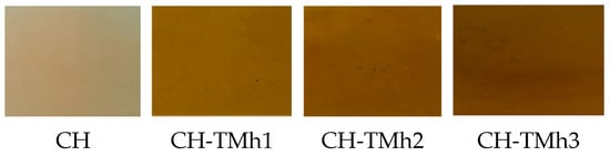 Appearance of films based on chitosan without and with the addition of mountain germander hydrolate; CH—chitosan-based film without added hydrolate; CH-TMh1, CH-TMh2, CH-TMh3—chitosan-based films with the addition of mountain germander hydrolate in a concentration of 0.6%, 0.8%, and 1.2%, respectively.