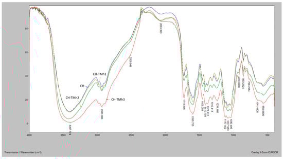 FTIR spectra of chitosan films supplemented with mountain germander hydrolate CH—chitosan-based film without added hydrolate; CH-TMh1, CH-TMh2, CH-TMh3—chitosan-based films with the addition of mountain germander hydrolate in concentrations of 0.6%, 0.8%, and 1.2%, respectively.