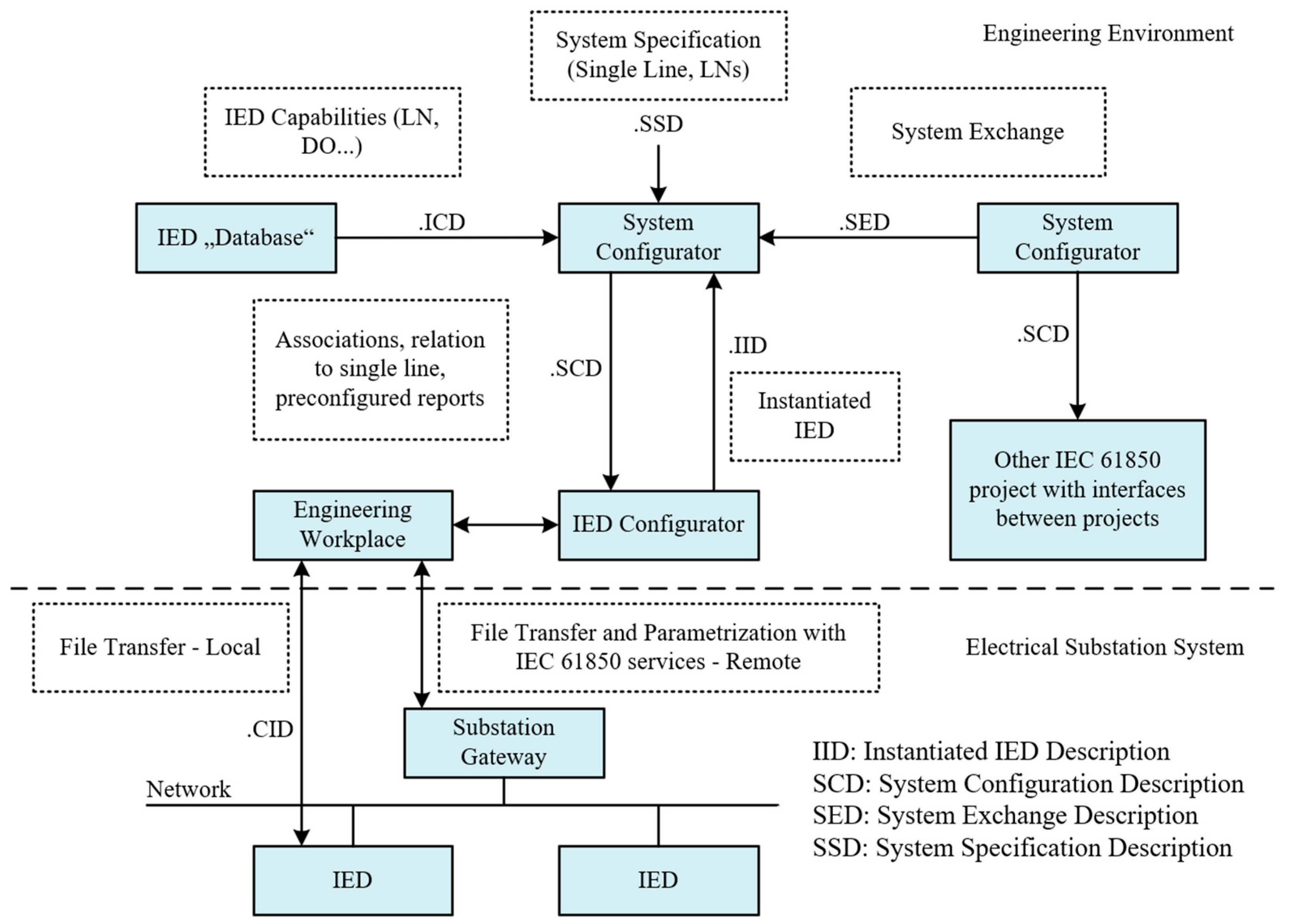 - ICD: defines the functional and communication capabilities of an IED, serving as a basis for integration into the system;