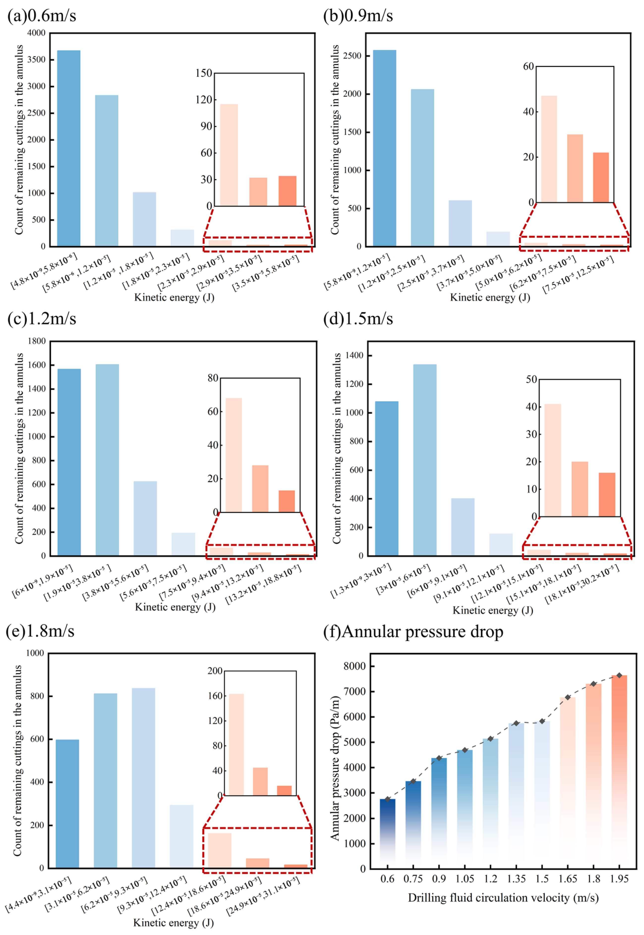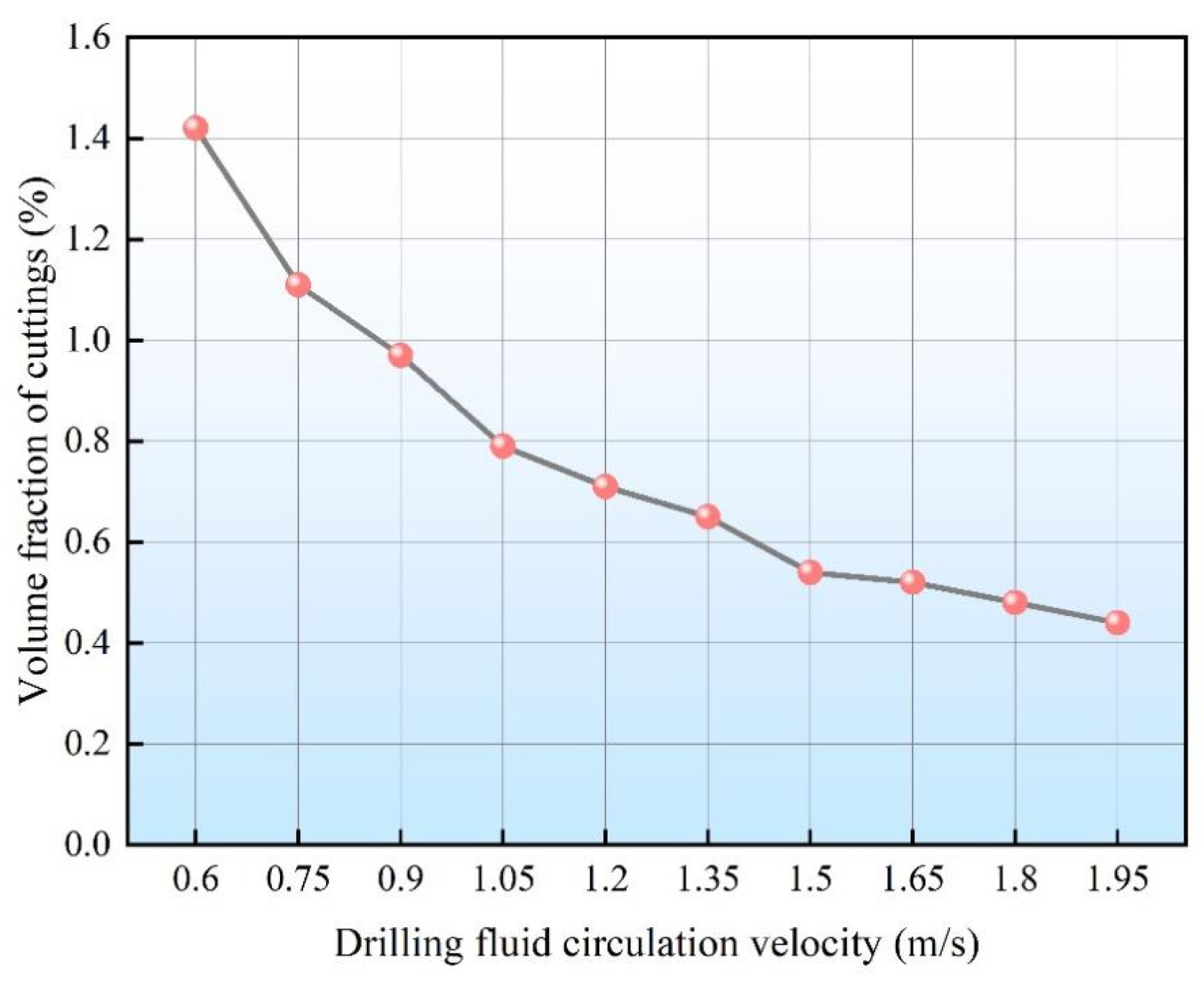 - For flexible drill pipes rotating at 30 rpm, increasing the drilling fluid flow rate significantly reduces the annular cutting concentration and enhances the hole cleaning efficiency. The volume fraction of cuttings exhibited the most significant reduction when the flow rate increased from 0.6 m/s to 0.9 m/s. However, beyond approximately 1.5 m/s, the suspension and transport capacity of cuttings reached saturation, resulting in diminishing returns in terms of hole cleaning efficiency with further flow rate increases. Concurrently, the annular pressure drop rose sharply with increasing flow velocity, increasing from 2752.39 Pa/m at 0.6 m/s to 7642.63 Pa/m at 1.95 m/s. The improvement in hole cleaning efficiency at high flow rates is smaller compared to that observed at relatively low velocities.