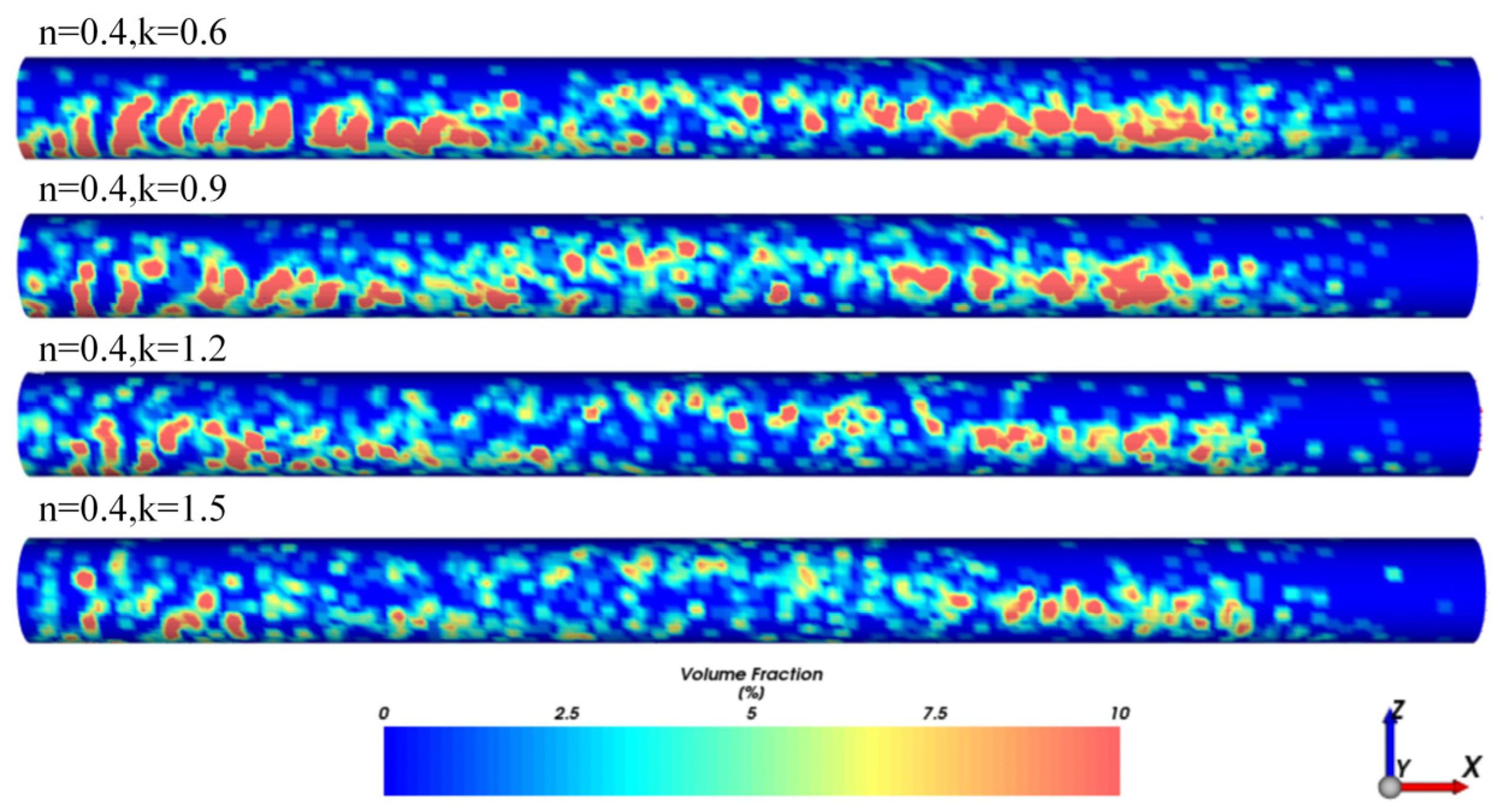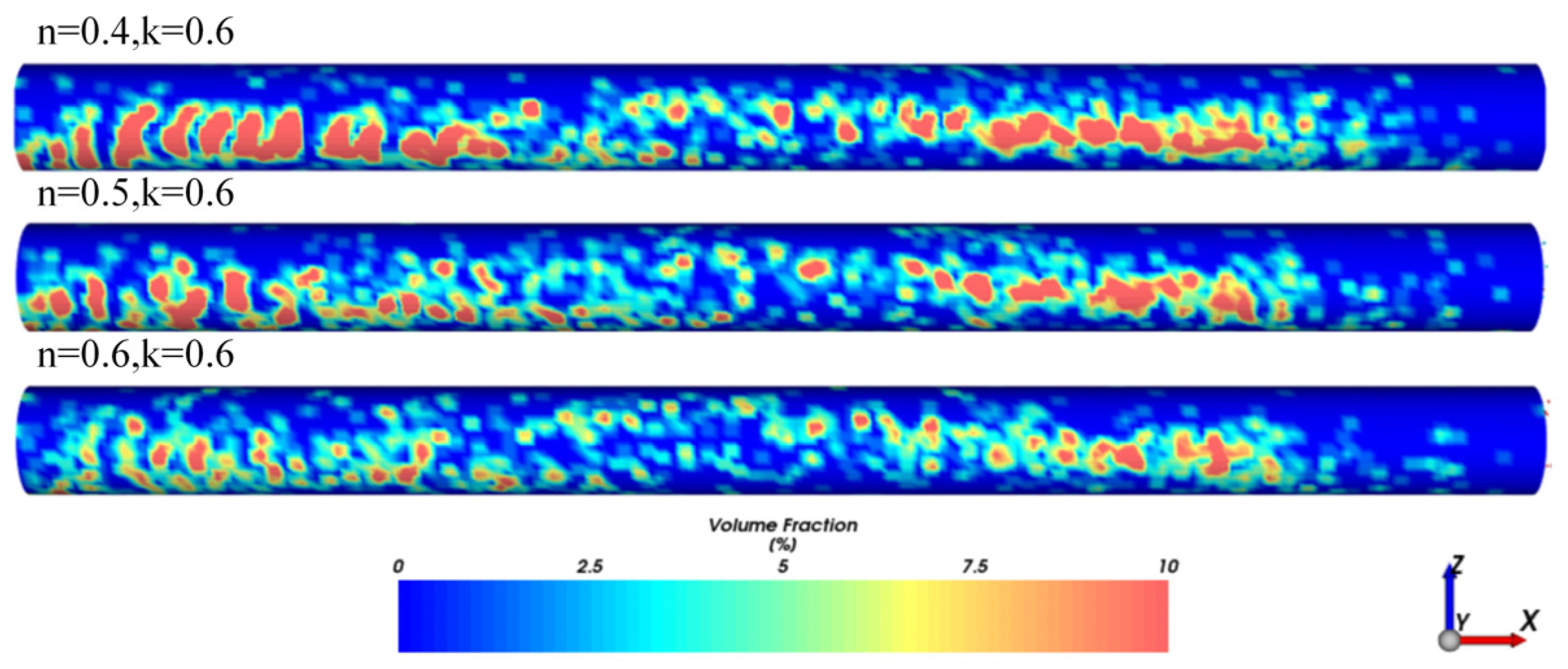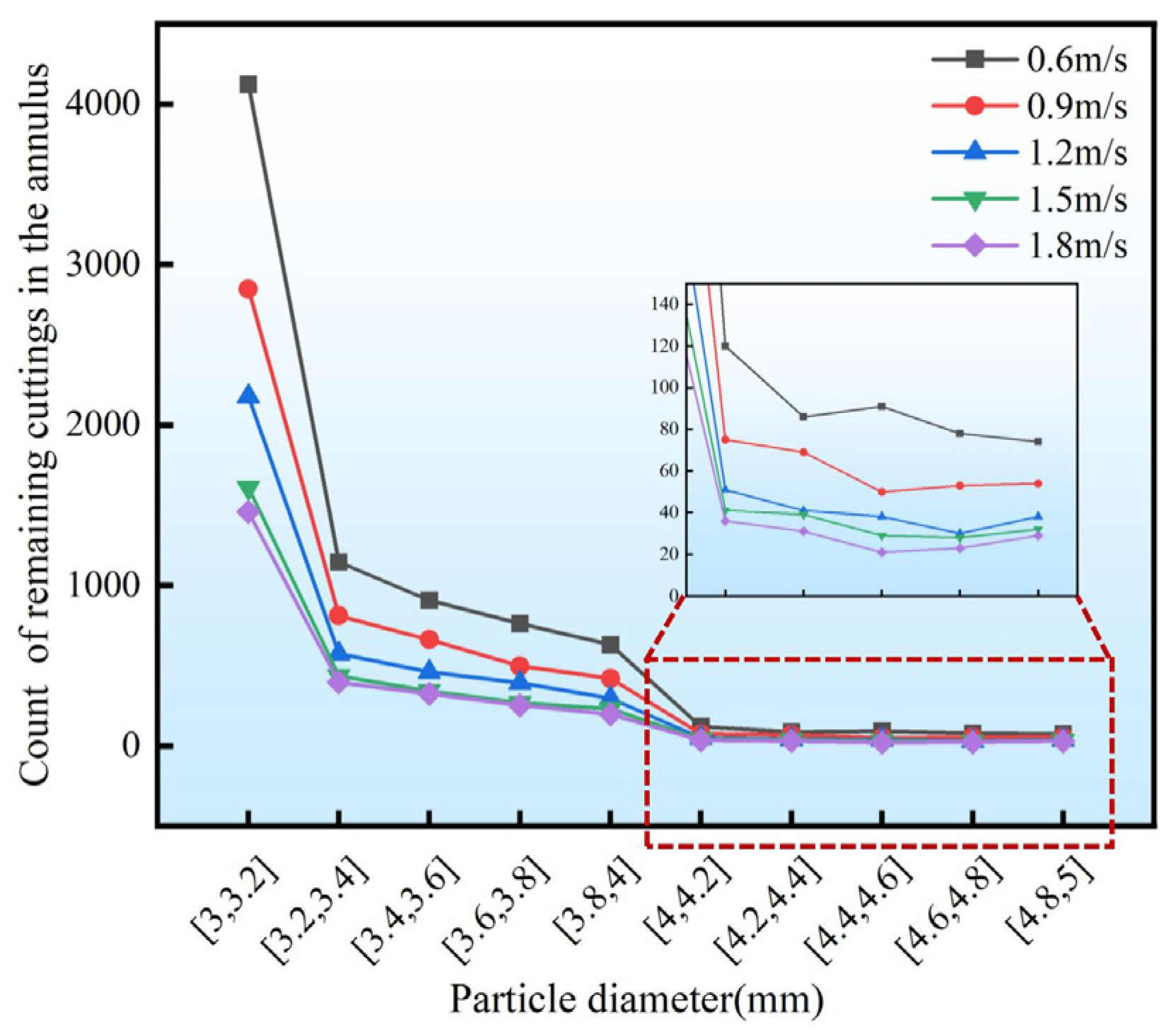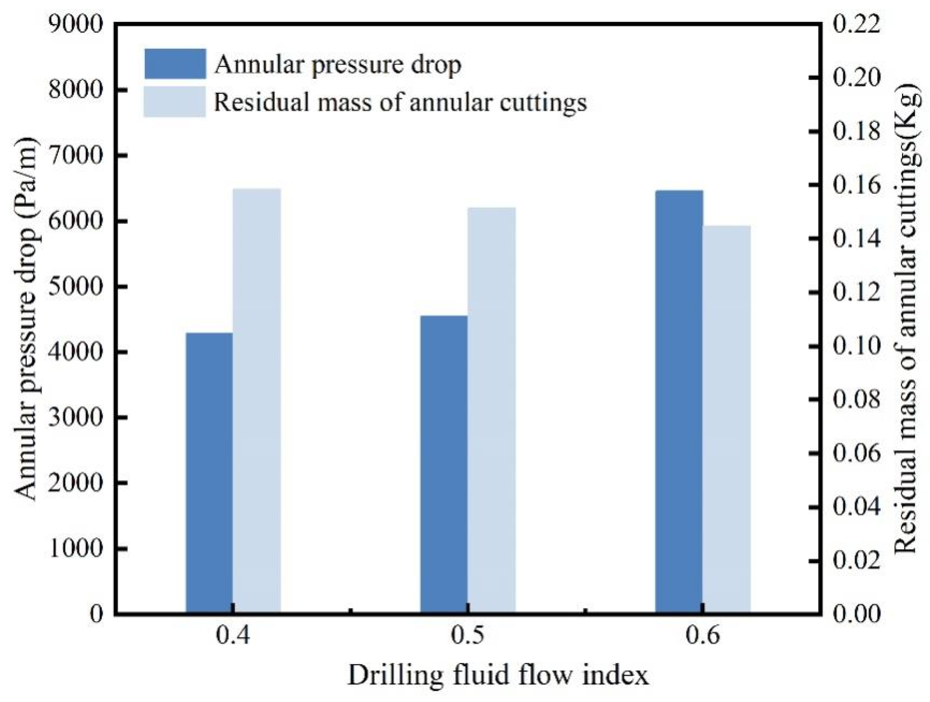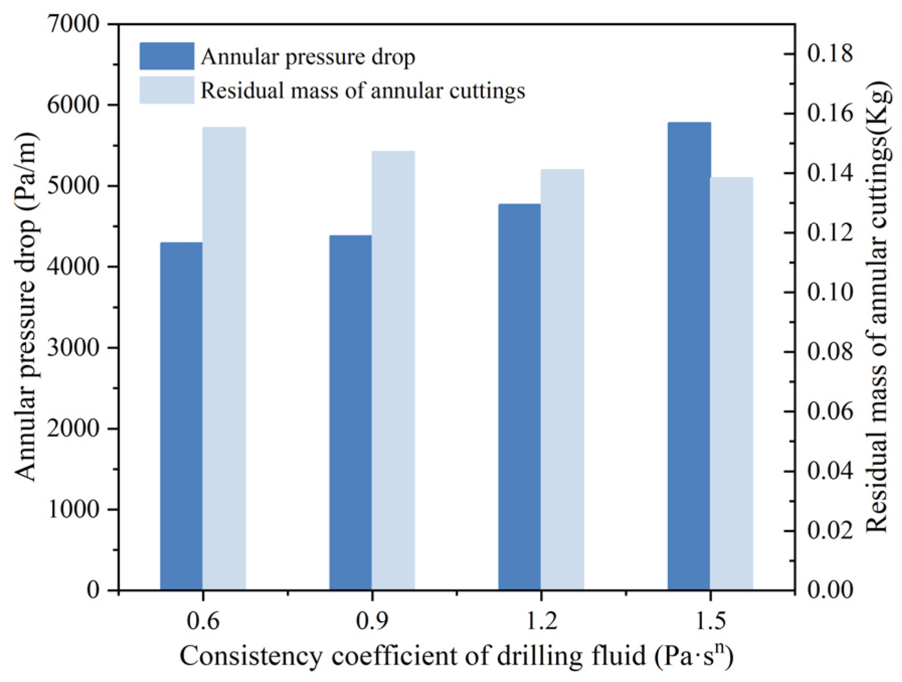 - Under power-law fluid conditions, increasing the flow behavior index n (from 0.4 to 0.6) reduces the mass of residual cuttings in the annulus from 0.158 kg to 0.144 kg, while increasing the consistency coefficient k (from 0.6 to 1.5) lowers it from 0.155 kg to 0.138 kg. These results indicate that raising either n or k enhances the cutting suspension and transport capacity. However, the improvement in cleaning efficiency is relatively limited in both cases and is accompanied by a significant increase in annular pressure drop—rising from 4293.39 Pa/m to 6456.61 Pa/m when n is increased—with a similar trend observed for k. Therefore, optimizing the rheological parameters of drilling fluid should not focus solely on increasing a single index. Instead, a comprehensive balance between cutting-carrying capacity and annular pressure loss must be achieved under specific downhole conditions to avoid excessive circulating pressure and the risk of wellbore instability.