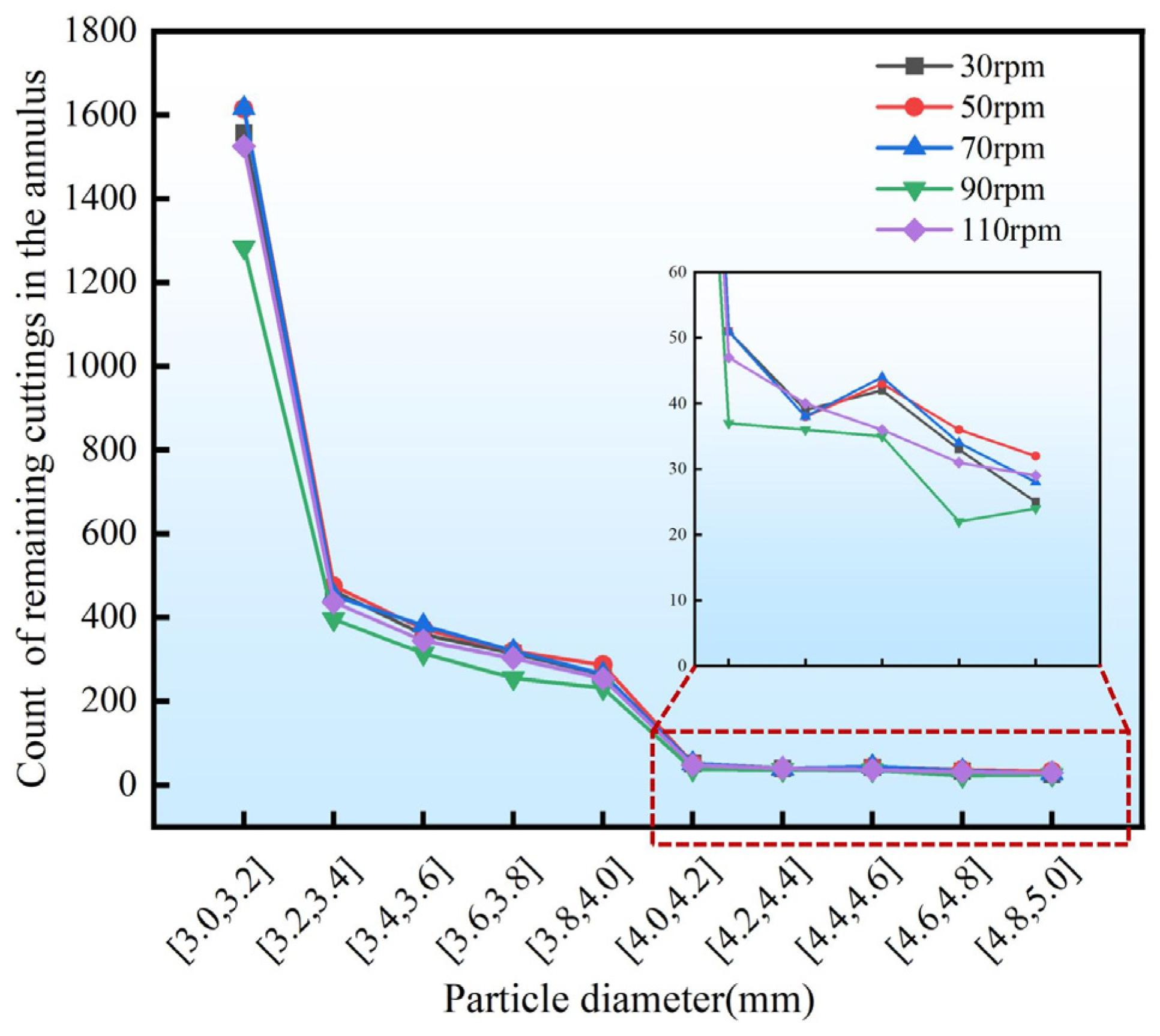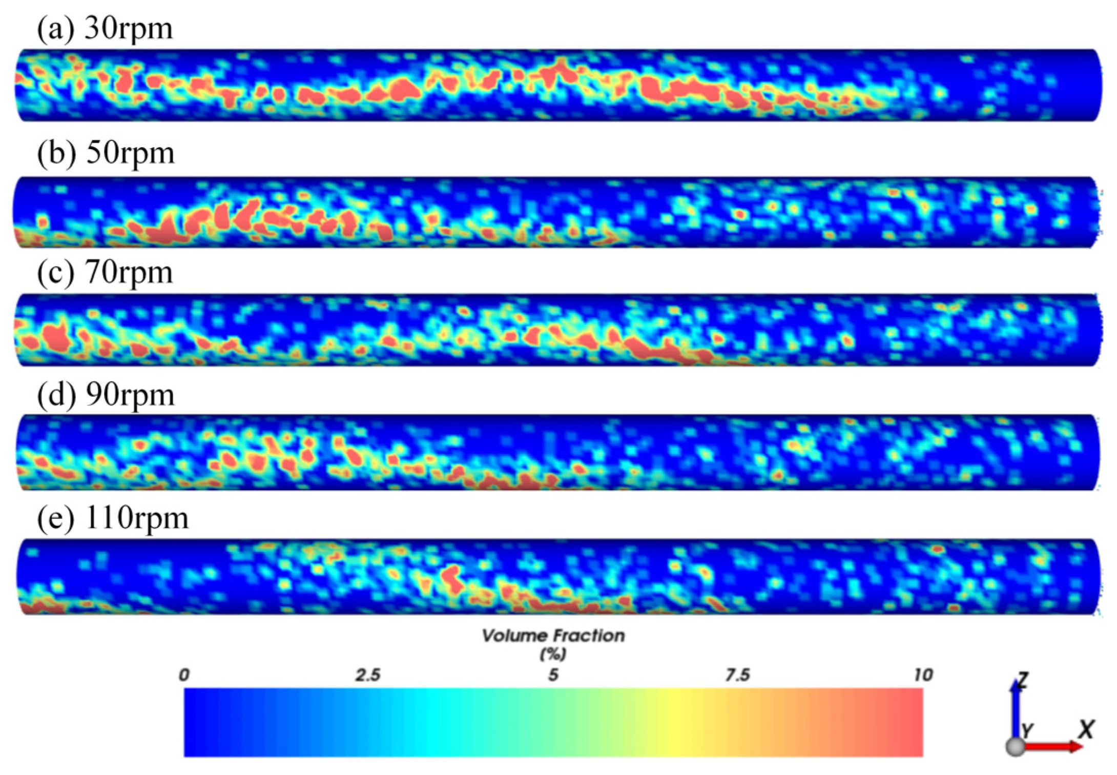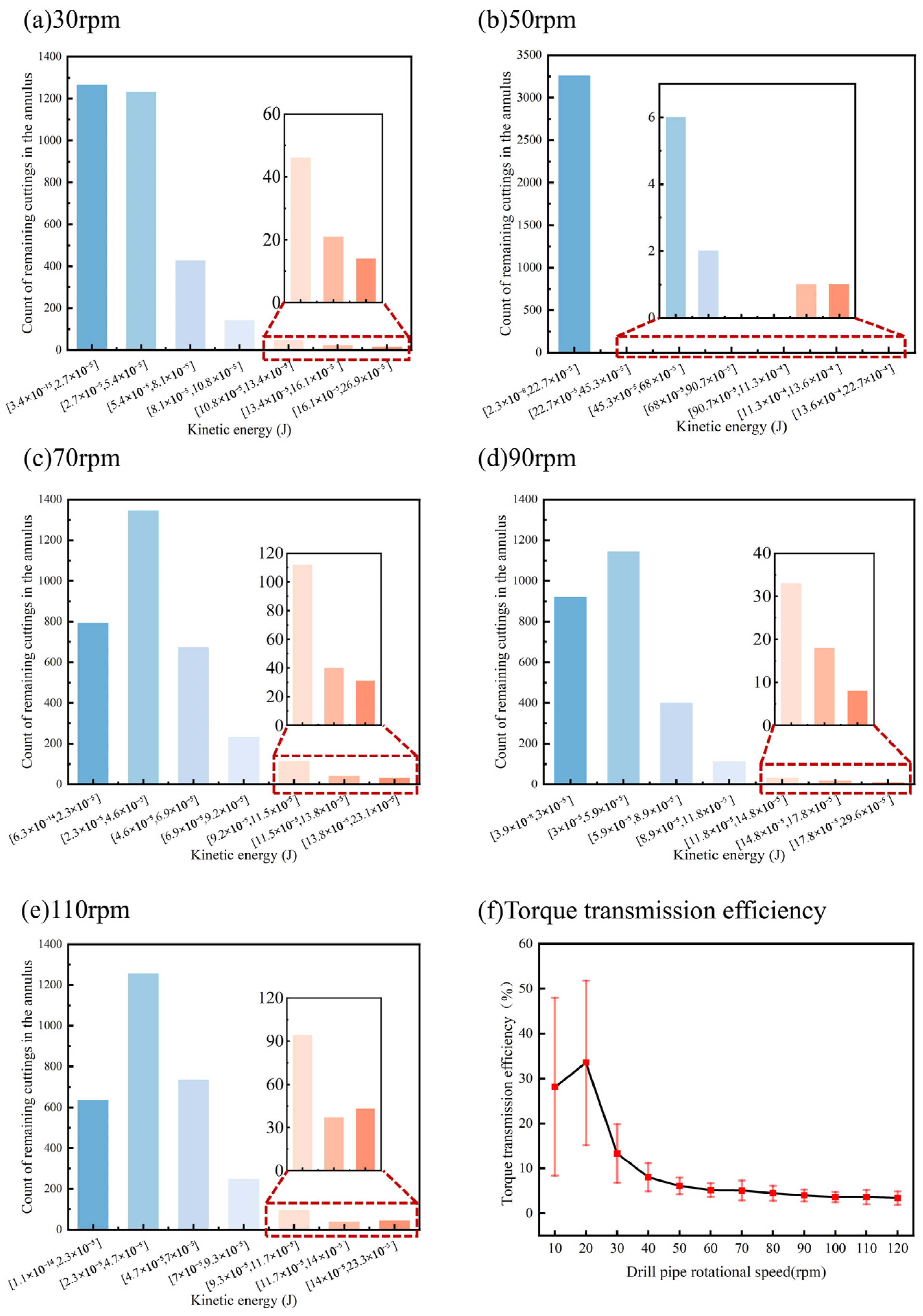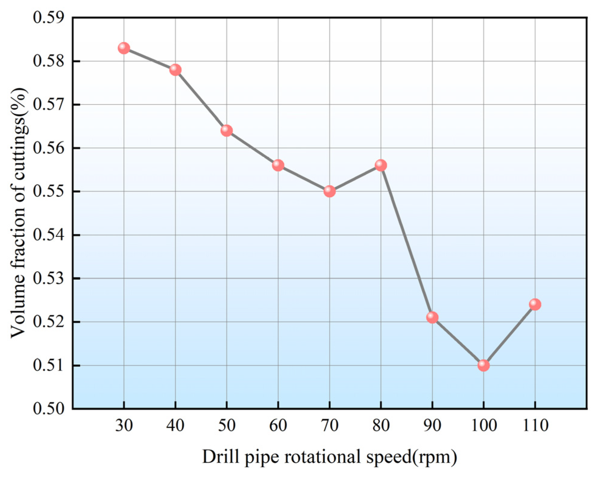 - At a drilling fluid flow rate of 1.42 m/s, increasing the drill pipe rotational speed of flexible drill pipes from 30 rpm to 100 rpm reduced the annular cutting volume fraction from 0.58% to 0.51%, indicating a measurable improvement in hole cleaning efficiency. However, this improvement is subject to significant limitations. First, the enhancement in wellbore cleaning efficiency achieved by increasing rotational speed is inferior to that attained through flow rate optimization. Second, higher rotational speeds primarily improve the suspension of fine cuttings (3.0–3.2 mm), but yield minimal improvement in the transport efficiency of larger cuttings (4.8–5.0 mm), which are predominantly influenced by gravitational settling. More critically, increased rotational speed results in a sharp decline in torque transmission efficiency. When the rotational speed is raised from 30 rpm to 110 rpm, torque transmission efficiency drops from 13.31% to 3.62%, indicating that over 70% of input energy is dissipated as frictional losses.