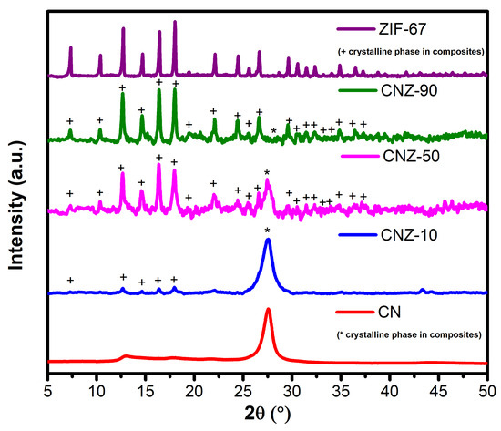 XRD patterns of CN, ZIF-67 and CNZ-x composites.