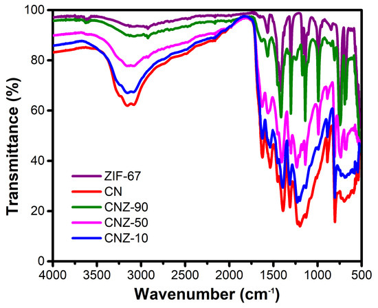 Figure 3 presents the FTIR spectra of the material, and Table S1 presents the comparative FTIR band assignments for CN, ZIF-67, and CNZ-x.