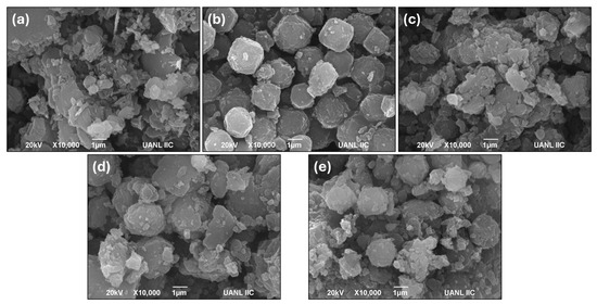 Figure 4 shows the surface morphologies of CN, ZIF-67 and the CNZ-x composites, as examined by scanning electron microscopy (SEM). The pristine g-C3N4 (Figure 4a) exhibits an irregular, stacked lamellar morphology with aggregated sheets and a rough surface [70,71,72]. These layers are highly aggregated, forming a dense structure with large interparticle voids; this is consistent with the material’s layered graphitic structure [73].