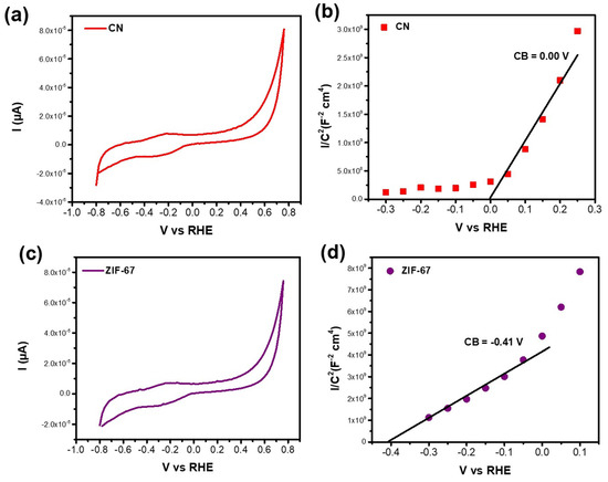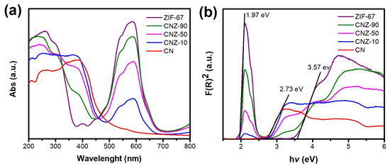 The optical properties of CN, ZIF-67, and the CNZ-x composites were investigated. UV–Vis diffuse reflectance spectroscopy (DRS) was used to investigate their properties. The related spectra and Tauc plots derived from the Kubelka–Munk function (see Equation (5)) are shown in Figure 6a,b.