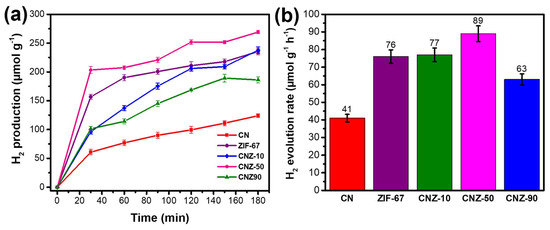 (a) Hydrogen production at different times (μmol g−1) and (b) Hydrogen Evolution Rate at 3 h (μmol g−1 h−1) of CN, ZIF-67, and CNZ-x.