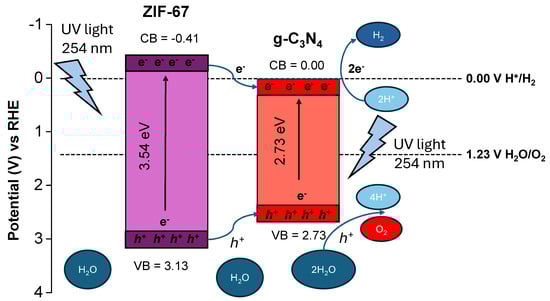 Graphitic carbon nitride (g-C3N4) has emerged as one of the most versatile metal photocatalysts due to its band gap (~2.7 eV), chemical stability, and ability to participate in visible-light-driven redox reactions [20,21]. Recent studies highlight its tunable electronic structure and enhanced charge separation when combined with porous materials or transition-metal centers [22,23,24]. On the other hand, ZIF-67, a zeolite framework composed of Co2+ ions and 2-methylimidazole [25,26]. It has a high surface area, abundant Co–N active sites, and well-defined porosity that facilitate molecular diffusion and surface reactions, characteristics of the structural and functional versatility of MOFs [27]. The ZIF-67 was applied in different fields like adsorption [28,29], catalysis [30,31], batteries [32] and fuel cells [33]. Its photoactivity has been associated with ligand-metal charge transfer (LMCT) processes and the involvement of Co2+ centers in catalytic cycles, a mechanism that has been extensively studied in photoactive metal–organic frameworks [30]. The strategic integration of semiconductors, such as g-C3N4, with MOFs to form heterostructures is a recognized approach to improve charge separation and photocatalytic performance. In particular, cobalt-based MOFs, such as ZIF-67, are ideal candidates for this synergy in reactions such as photocatalytic H2 production [34,35,36]. The integration of g-C3N4 with ZIF-67 establishes an intense interfacial contact that enhances charge separation, suppresses recombination, and significantly increases photocatalytic efficiency for hydrogen evolution and other solar-driven reactions [37,38]. These findings, consistent with the design principles of efficient heterostructures, support the relevance of g-C3N4/ZIF-67 heterostructures as promising candidates for water photodissociation.
