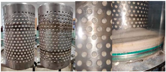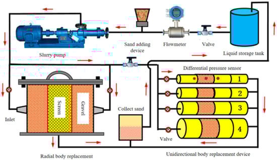 Experimental setup and methods: In order to simulate the transport blockage process of formation fluid carrying formation sand and intruding into the screen and gravel, a comprehensive sand prevention and replacement simulation and evaluation visualization experimental platform is used to visualize most of the sand-blocking and transport process. The flow chart is shown in Figure 1, and the physical figure is shown in Figure 2. The radial flow replacement simulation experiment device consists of the main body radial replacement device, liquid storage and mixing tank, sand collector, sand slurry pump, data acquisition sensor, control system, and so on. The main radial displacement device is the core component, with an inner diameter of 300 mm and a height of 250 mm, capable of accommodating short sections of sieve pipe with an outer diameter of 90–250 mm and a length of 245–248 mm [12,13,14,15,16,17]. The short section of the screen is placed in the center of the container and then closed at both ends to ensure that the sand-carrying fluid enters the screen from the side through the sand-blocking layer; the experimental fluid carries the formation sand from the six inlet ports distributed on the outer cylinder of the device into the container, which impacts the screen directly to simulate the sand discharge and the sand-blocking process at the bottom of the actual wells. During the experiment, the differential pressure through the screen is measured by 2–4 pairs of differential pressure sensors set inside and outside the screen at the bottom of the vessel and is collected in real time by a computer [18,19,20].