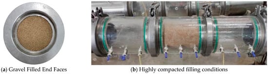 After the clogging equilibrium, the main unit of unidirectional flow replacement was disassembled, and the clogging pattern of the gravel layer was analyzed. As shown in Figure 6a, a large amount of silt particles were retained at the end face of the gravel layer; after removing the surface silt, the amount of silt retained decreased substantially after 5 mm from the end face of the gravel layer, and with the increase in the depth of the gravel layer, the amount of silt particles retained decreased gradually, as shown in Figure 6b–d.