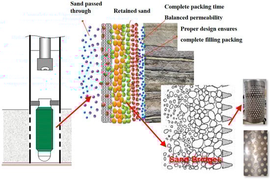 The mechanism of the screen’s external space-sorting bridge-filling blockage is to extend from the screen to the outside; the blocked particles become smaller and smaller in size, and their permeability drops lower and lower, which increases the flow resistance and causes the oil well to reduce production. The mechanism of clogging the bridge inside the sand-blocking medium of the screen is that the fine solid-phase particles enter into the sand-blocking porous medium; the irregularity and non-homogeneity of the pores of the sand-blocking medium make it difficult to discharge the solid-phase particles that enter into the sand-blocking medium, which are retained inside the sand-blocking medium, resulting in the reduction in permeability of the mechanical screen and the formation of a clog.