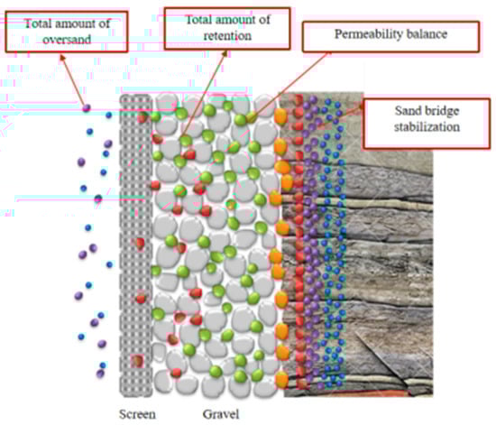 After the formation of multi-level bridge clogging inside and on the surface of the gravel layer, respectively, the clogging process tends to stabilize. Under stable production conditions, the fluid passes through the 3-level bridge-clogging zone outside the gravel layer and the mixed clogging zone formed by the gravel layer and formation sand successively; then, it enters the wellbore through the screen. When the production conditions change, the original stable bridging structure may be damaged; along with the re-arrangement of the gravel layer, a new round of intra-layer bridging and extra-layer bridging is formed again.