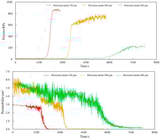 The experiment uses 150 μm, 200 μm, and 300 μm precision mesh screens, the liquid flow rate is 1.2 m3/h, and the median size of sand in the sand control accuracy is 220 μm. The experimental pressure and permeability curves are shown in Figure 10.