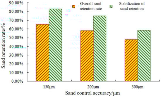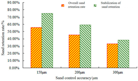 As shown in Figure 11, the overall sand retention rates of 150 μm, 200 μm, and 300 μm precision mesh screens during the experiment were 55.67%, 45.43%, and 33.17%, and the sand retention rate of the stabilized sand retention layer formed by the mud and sand and the screen at the late stage of clogging was 75.12%, 59.24%, and 38.24%. With the decrease in precision, the sand-retaining capacity of the screen is gradually improved, and the overall sand retaining rate increases by 10–12% for every reduction in one grade of precision.