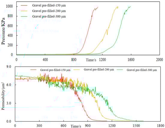 The experiments used 150 μm, 200 μm, and 300 μm gravel pre-filled screens, with a liquid flow rate of 1.2 m3/h; the median diameter of the compound formation sand was 220 μm. The experimental pressure and permeability curves are shown in Figure 14.