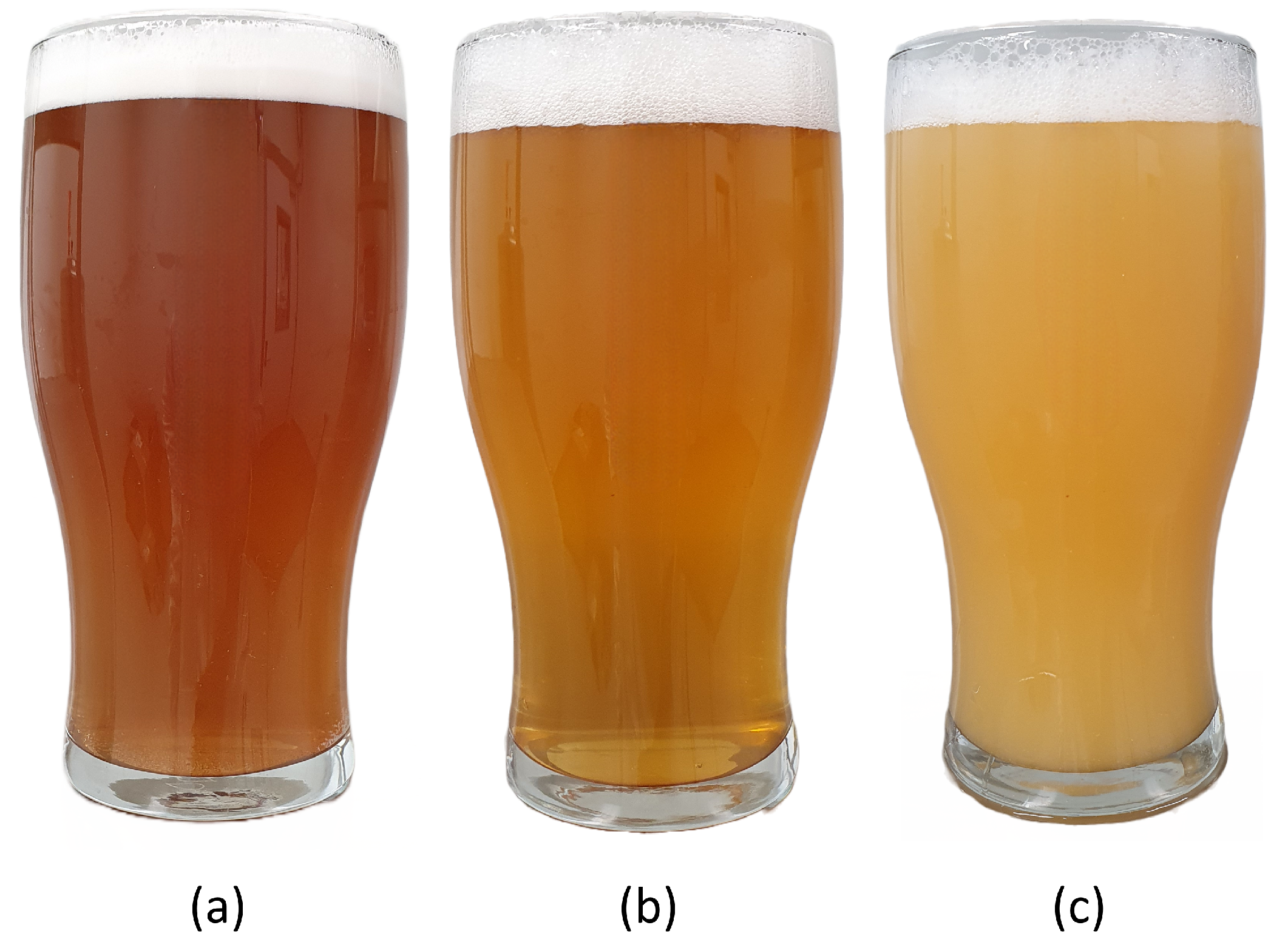 Figure 5 illustrates three representative beers produced from the IPA-style wort using different yeast configurations at 22 °C. Even with identical wort, differences in yeast physiology and fermentation temperature yield distinct appearance and flavour profiles, reflected in the corresponding apparent extract and pH trajectories.