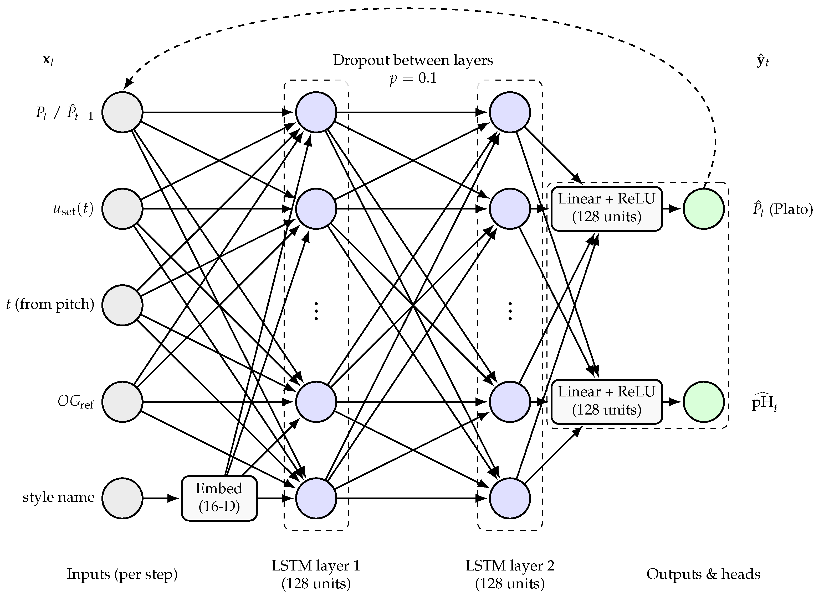 Inference proceeds in two phases. First, the history window is passed through the LSTM to initialise the hidden and cell states. The last apparent extract value (°P) in the history segment is retained as the starting point for the autoregressive decoder. Second, the model rolls forward step by step over the forecast horizon. At each forecast step, the decoder forms an input vector by concatenating the scaled future temperature setpoint, future time, original gravity (OGref), the previously predicted degrees Plato value, and the style embedding. This input is passed through the same LSTM, using the hidden and cell states carried over from the previous step. The apparent extract (°P) and pH heads then produce predictions for the current forecast step, and the degrees Plato prediction is fed back as the apparent extract (°P) input for the next step. In this way, predicted apparent extract acts as a surrogate state variable in the decoder, allowing the network to propagate its own predictions forward in time.