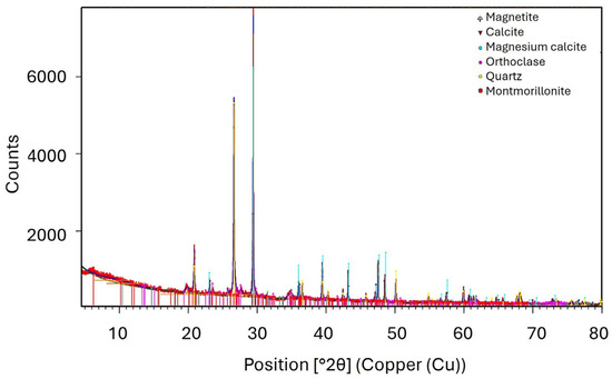 The X-ray diffraction (XRD) pattern of the clay-type lithium ore is shown in Figure 3. The diffractogram reveals that the sample is primarily composed of quartz, calcite, and montmorillonite. Minor phases include magnetite, magnesium calcite, and orthoclase. The identification of montmorillonite is particularly significant, as this clay mineral is commonly associated with lithium-bearing deposits, where lithium can substitute for Mg2+ in the octahedral sheet of the aluminosilicate structure. These findings are consistent with the mineralogical reconstruction presented in Table 2, which confirms montmorillonite as the dominant phase (56.2 wt.%), followed by quartz (22.8 wt.%) and carbonate minerals. Similar mineralogical assemblages—dominated by quartz, calcite, and montmorillonite—have been reported in clay-type lithium deposits in Sonora, Mexico [19,30], supporting the potential of these materials as alternative lithium resources. The presence of accessory minerals such as magnetite and feldspars suggests minor detrital contributions that may influence gangue behavior during leaching.
