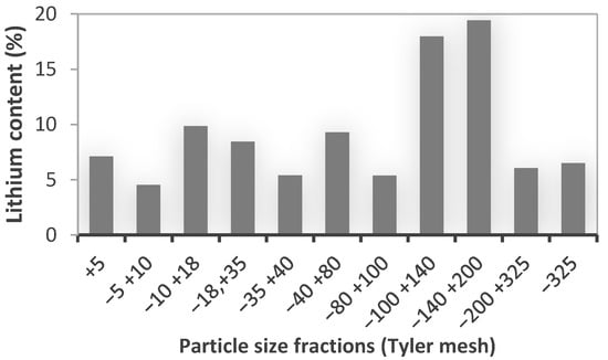 The particle-size distribution of lithium in the sample shows a distinct enrichment toward finer fractions, as illustrated in Figure 4. The highest lithium contents were observed in the −100, +140 and −140, +200 Tyler mesh fractions, corresponding to average particle sizes of approximately 149 µm and 105 µm, respectively. These fractions were therefore selected for the subsequent leaching experiments. This enrichment pattern indicates that lithium-bearing phases are preferentially concentrated in the fine material due to improved mineral liberation and partial exposure of lithium-bearing microstructures during grinding. In contrast, the coarser fractions (+5 to −40, +80 Tyler) exhibited lower lithium contents, likely reflecting incomplete liberation or encapsulation within the gangue matrix. The agreement between the granulometric behavior shown in Figure 4 and the particle sizes employed in the leaching methodology confirms that finer fractions represent the most reactive and representative feed for hydrometallurgical processing.