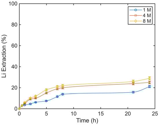 Lithium extraction as a function of time during conventional atmospheric leaching at different sulfuric acid concentrations (1–8 M H2SO4, 149 μm, 600 rpm, 20 wt.% solids).