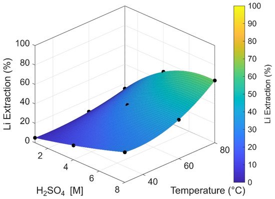 Response surface of lithium extraction (%) as a function of sulfuric acid concentration (1–8 M) and temperature (30–80 °C) under hot leaching conditions.