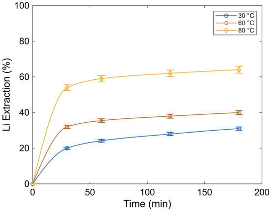 The influence of temperature (30, 60, and 80 °C) on lithium extraction under pressure leaching conditions at 50 psi O2 is shown in Figure 10. The results indicate a strong dependence of both leaching kinetics and final lithium extraction on temperature. At 30 °C, lithium extraction progressed slowly, reaching approximately 30% after 180 min, reflecting sluggish dissolution under mild thermal conditions. Increasing the temperature to 60 °C significantly enhanced the extraction rate, resulting in lithium recoveries of about 40% at the end of the leaching period. At 80 °C, a rapid initial increase in lithium extraction was observed, followed by a gradual approach to a plateau of approximately 64%, suggesting that higher temperatures promote faster dissolution. In contrast, the system progressively approaches equilibrium under the studied conditions. The tendency toward a plateau at elevated temperatures may be associated with secondary phenomena such as silica gel formation, aluminum hydrolysis, or surface passivation, which have been reported during acid leaching of clay-type materials and aluminosilicates [35,40,41,42]. These processes can limit further lithium release by reducing effective surface area or hindering mass transfer, particularly at higher temperatures and prolonged leaching times.