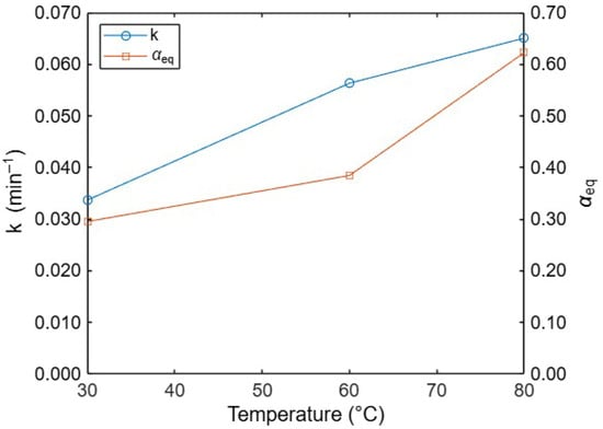 The temperature dependence of the kinetic parameters obtained from the model is summarized in Figure 11, which shows the variation in the apparent rate constant and the equilibrium extraction with temperature. At 30 °C, lithium dissolution proceeds slowly, with a low apparent rate constant (k = 3.1 × 10−3 min−1) and limited equilibrium extraction (αeq ≈ 0.31), indicating restricted accessibility of lithium-bearing sites under mild thermal conditions. Increasing the temperature to 60 °C significantly enhances both parameters (k = 6.4 × 10−3 min−1 and αeq ≈ 0.40), reflecting increased disruption of the aluminosilicate structure and improved lithium mobility. At 80 °C, the highest values are obtained (k = 1.23 × 10−2 min−1 and αeq ≈ 0.64), demonstrating that elevated temperature strongly accelerates lithium dissolution and increases the overall extent of extraction.