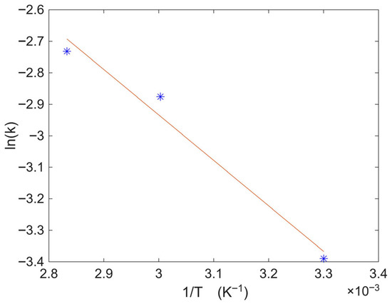 To assess the influence of temperature on the dissolution rate, the dependence of the apparent rate constant (k) on temperature was evaluated using the Arrhenius equation (Equation (9)). The Arrhenius plot of ln k versus 1/T is shown in Figure 13. A linear relationship was obtained over the investigated temperature range, confirming Arrhenius-type behavior for lithium dissolution under pressure leaching conditions. From the slope of the linear fit, the apparent activation energy was calculated as Ea = 12.1 kJ·mol−1. In hydrometallurgical systems, apparent activation energy values below approximately 20 kJ·mol−1 are commonly associated with weakly activated reaction–solution or ion-exchange controlled processes, whereas higher values (typically >40 kJ·mol−1) are characteristic of chemically controlled surface reactions, and intermediate values are often linked to diffusion-controlled mechanisms. The Ea value obtained in this study falls within the range reported for weakly activated dissolution processes in clay minerals. Although similar activation energies are sometimes associated with diffusion-limited behavior, this interpretation applies only when diffusion-based kinetic models adequately fit the experimental data, which is not the case under the present conditions. Instead, the combination of low Ea, the increase in αeq with temperature, and the excellent fit of the pseudo-first-order model supports a reaction-controlled dissolution mechanism [43,44].