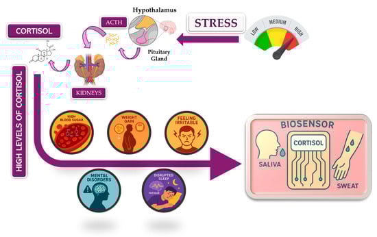 One of the major health problems of modern society is associated with stress, a risk factor with high impact on quality of life and mental health. The factors of increased levels of stress can be classified depending on their source, however a high standard lifestyle or the lack of time in our daily activities are the main factors which affect our nervous and hormonal systems [1]. Stressful life events or experiencing traumatic life events have also been associated with poor outcomes in our biological system, weight gain, sleep problems and mental disorders [2,3], as illustrated in Figure 1. This figure shows the impact of high cortisol levels on our body and the possible effects of these values on human life. Biosensors based on cortisol detection can improve patients’ lives by allowing the identification of a pathology with facile devices able to investigate also non-conventional body fluids.