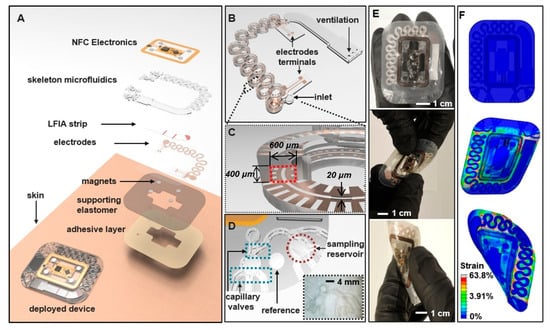 Microfluidic systems for cortisol detection: (A) Structure of the device; (B) magnified view of the main serpentine skeletal channel for cortisol tracking; (C) cross-sectional view of the main channel; (D) microfluidic structures with the optical image of the system; (E) optical (Top), mechanical twisting (Middle), and bending (Bottom) mechanisms; (F) 3D modeling of the system. Reprinted from Kim et al.’s open-source article [65].