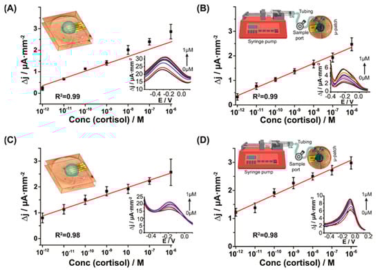 In vitro cortisol detection using the wearable integrated microfluidic patch: (A) buffer without microfluidics and (B) with microfluidics; (C) artificial sweat without microfluidics and (D) with microfluidics. Reprinted from Singh et al.’s open-source article [86].