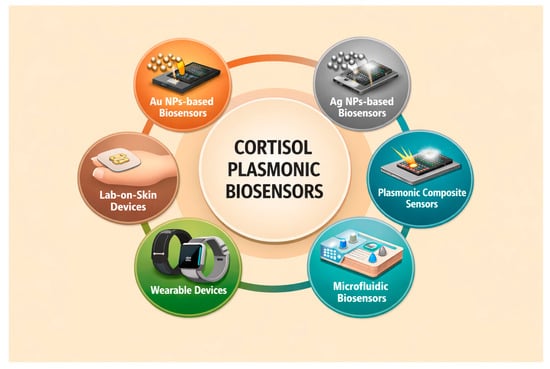 Current strategies for assessing human stress levels typically rely on physiological, behavioral, or psychological indicators. Several cortisol detection techniques have been described in the literature; however, most of them are based on conventional methods that require invasive sample collection [36]. These standardized invasive approaches may not always be appropriate, especially given the added stress imposed on patients during sample collection, which can alter the physiological parameters under investigation. Repeated testing, a process often necessary for hormonal monitoring, may discourage individuals from seeking medical evaluation due to the discomfort and inconvenience associated with such procedures. Furthermore, psychological stress related to sample collection may artificially elevate cortisol levels, potentially leading to inaccurate or inconclusive diagnostic outcomes. Additional limitations of conventional methods include complex sample preparation protocols, reduced analytical precision, the need for large sample volumes, reliance on costly instrumentation, and long processing times. A promising alternative lies in the development of biosensors based on nanotechnology for efficient and fast detection. Portable and miniaturized sensing devices using plasmonic or non-plasmonic nanoparticles increase the detection sensitivity and efficiency, while offering a more patient-friendly solution for cortisol monitoring.