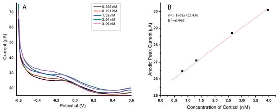 Shama et al. proposed the development of a sensitive device based on Ag NPs-doped MIPs for cortisol detection in aqueous and biological samples [103]. The optical-morphological characterization for AgNPs exhibited a spherical shape with an average size of 40 nm. For proper optimization, the authors tested five different cortisol concentrations (0.395, 0.791, 1.32, 2.64, and 3.96 nM) in phosphate-buffered saline (PBS) using differential pulse voltammetry (DPV) techniques, thus obtaining a calibration curve for further cortisol quantification, which was proven to offer accurate and reproductible results, as can be observed in Figure 5. The study revealed that the addition of Ag NPs enhances the biosensor’s performance in terms of sensitivity and selectivity, mostly due to the high surface-to-volume area of the nanoparticles. Cortisol detection proved high yield in human plasma samples, leading to a very low detection limit of 0.214 nM, which could hardly be achieved through classical detection methods [103].