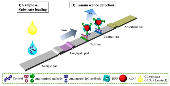 Illustration of the developed sandwich-type cortisol CL-based LFA design. Reprinted from Kim et al.’s open-source article [123].