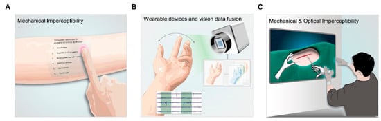 (A) The mechanical invisibility for skin-conformal integration; (B) optical transparency for information identification and wearable components blending; (C) the combination of mechanical and optical imperceptibility, which will enhance the performance of wearable devices for extended reality applications. Reprinted from Won et al.’s open-source article [129].