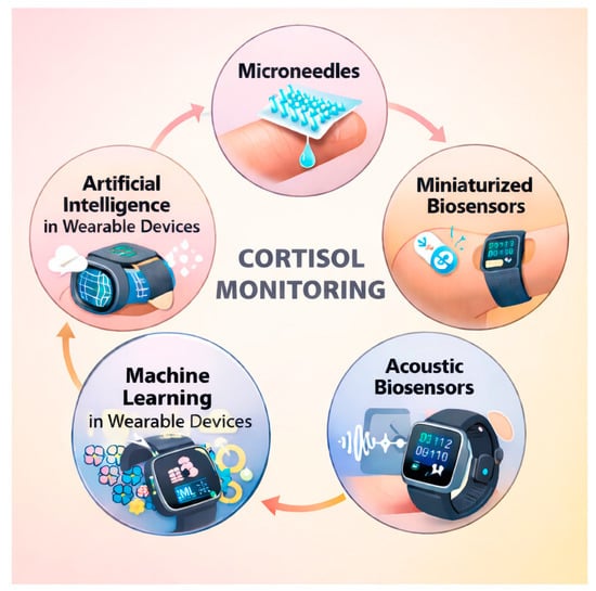 - Balasamy, S.; Atchudan, R.; Arya, S.; Sundramoorthy, A.K. Emerging Trends in Wearable and Non-Invasive Cortisol Sensing Technologies—A Review. J. Mater. Chem. B 2025, 13, 13154–13183. [Google Scholar] [CrossRef]