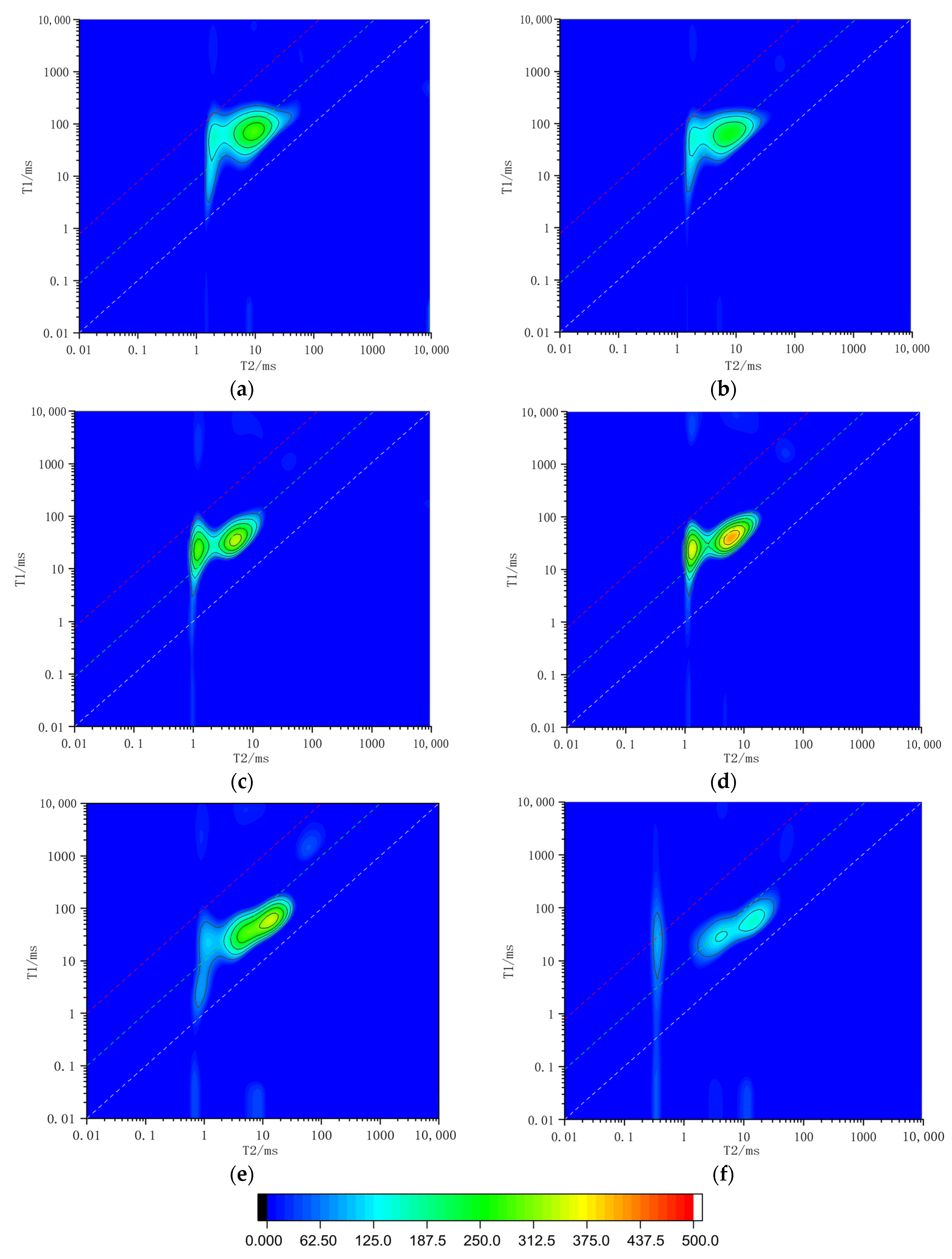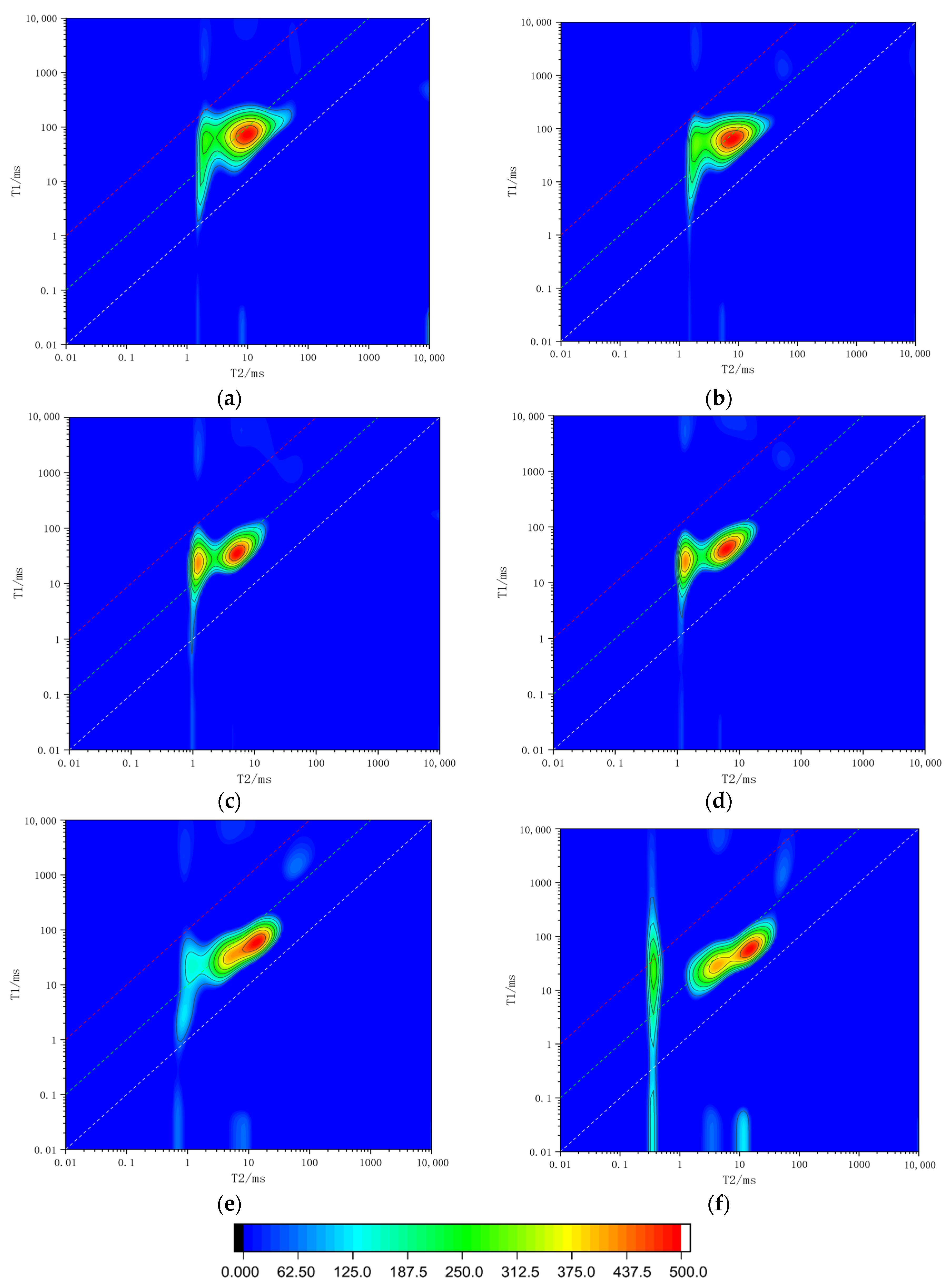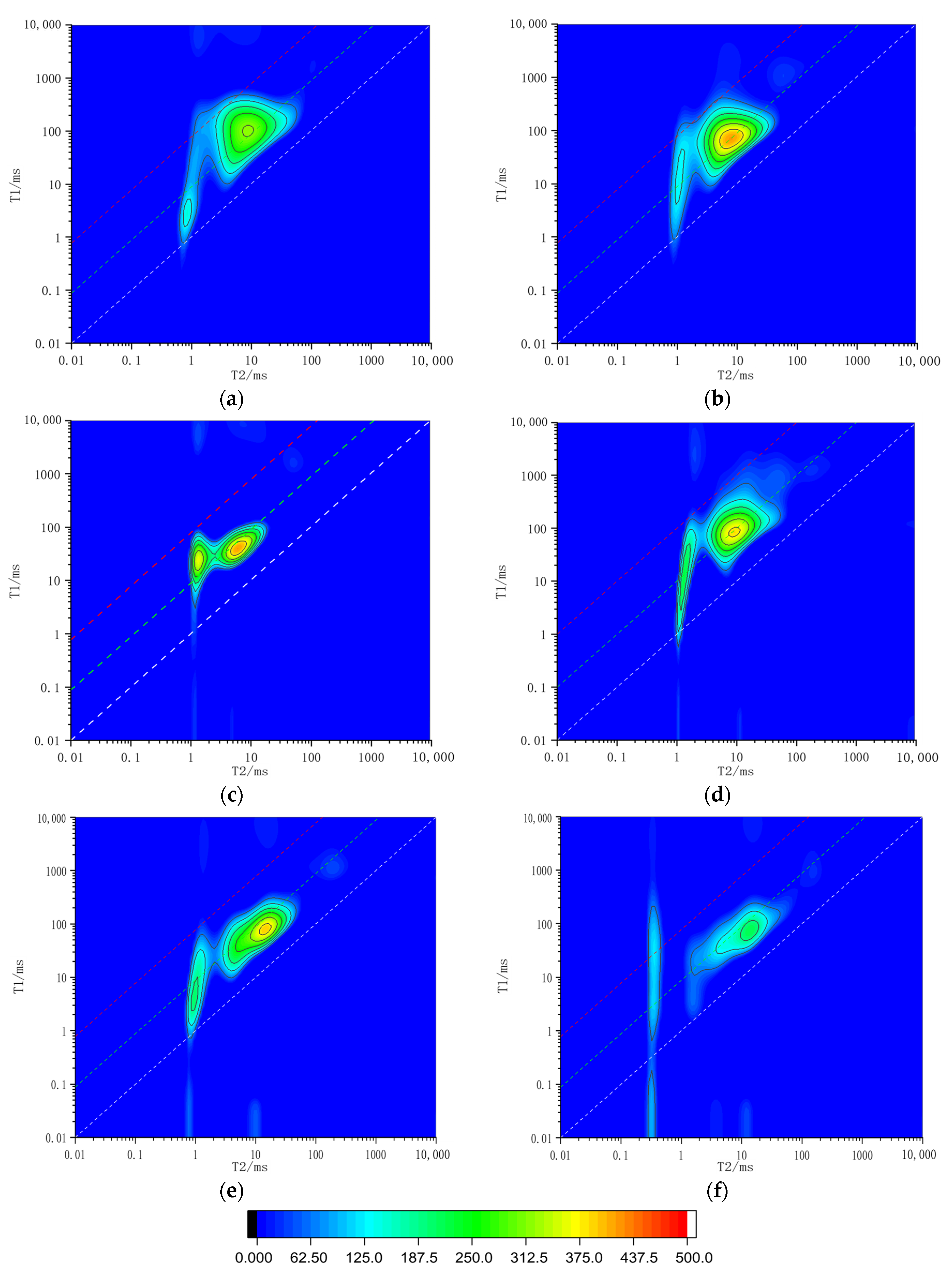 - Qin, Y.; Zhang, G.; Luo, C.; Zhang, J.; Wang, Z. Two-Dimensional NMR Characteristics of Jimsar Shale Oil Reservoir. J. Cent. South. Univ. 2022, 53, 3387–3400. [Google Scholar] [CrossRef]