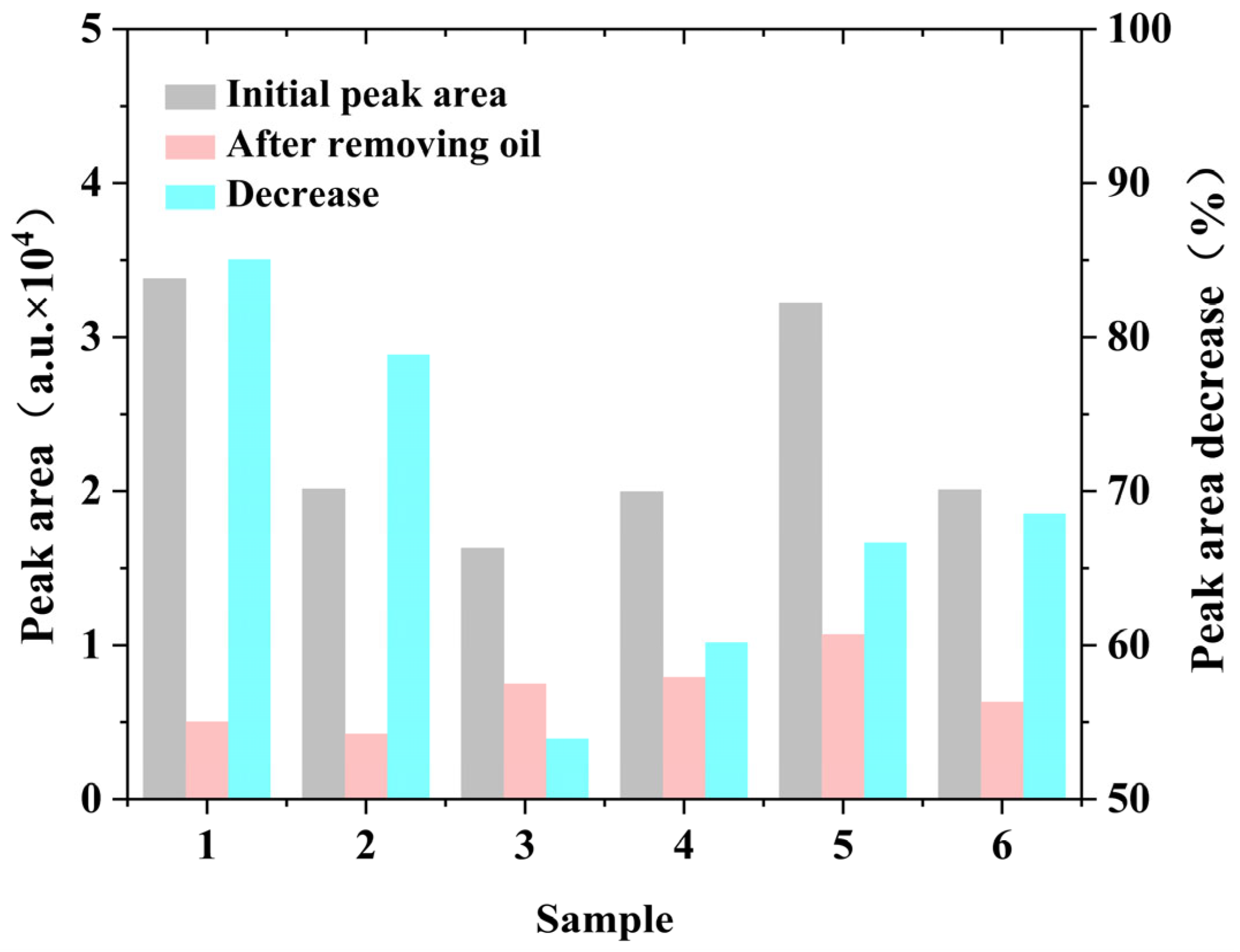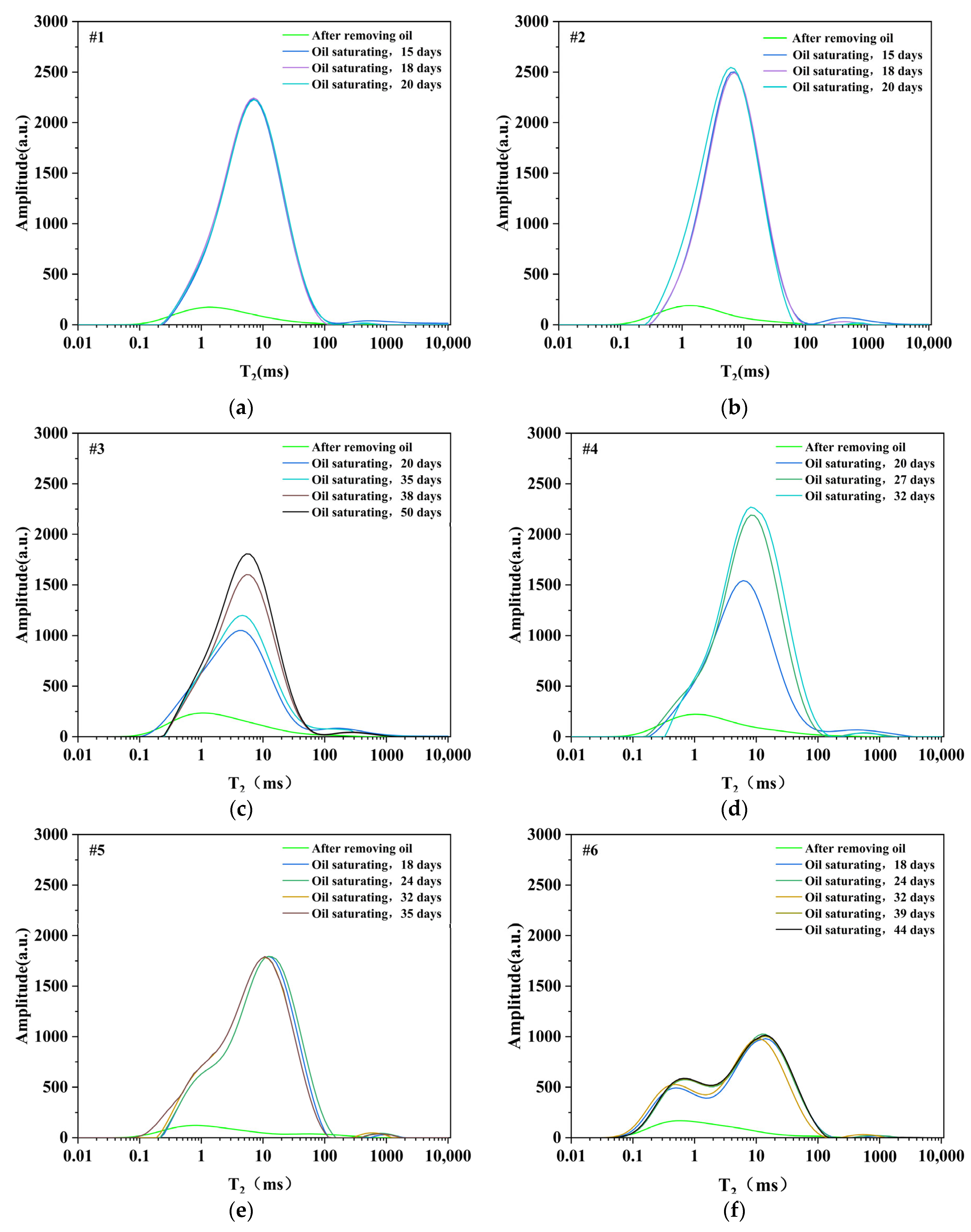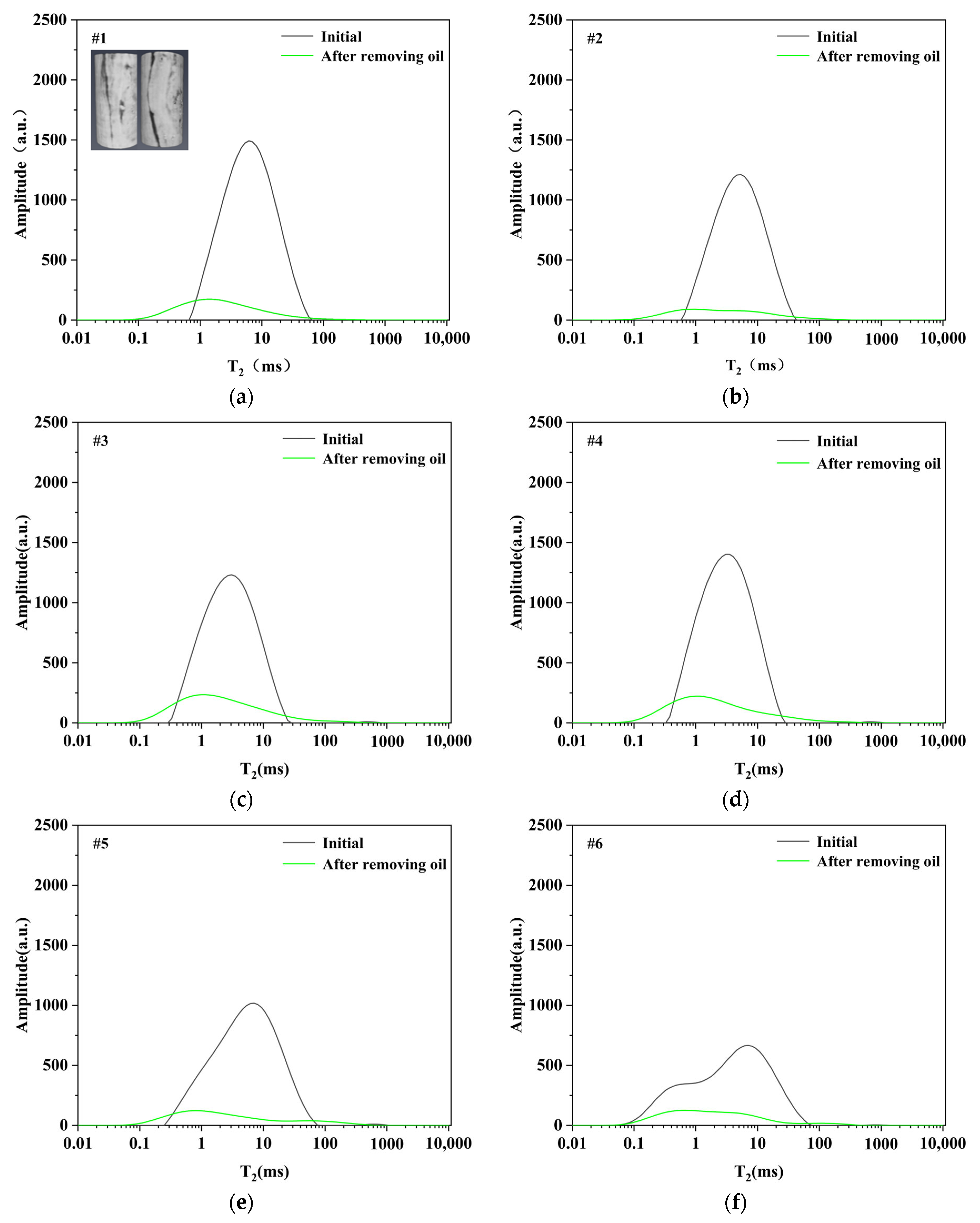 - During oil-washing, preferential evacuation of hydrocarbons occurs in macroscopic pores, with residual oil predominantly localized within microscopic voids—manifested as leftward migration of T2 spectral peaks. Under elevated temperatures and pressures, microfracture proliferation emerges, with synergistic fracture-channel effects impelling crude oil displacement into finer capillaries. This phenomenon generates T2 spectral signatures in previously quiescent regions.