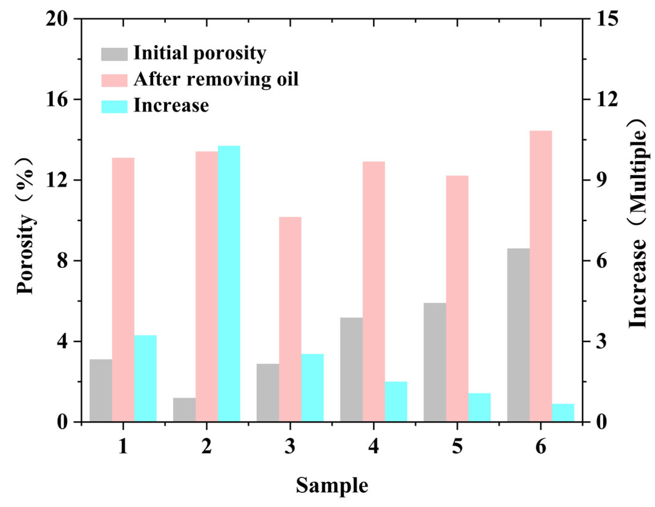 - Oil-washing profoundly modifies petrophysical parameters. Post-treatment drying yields an average 3.21-fold porosity enhancement and 2.16-fold permeability augmentation, although isolated reductions occur. These anomalies are attributed to thermo-mechanically induced microfractures during processing, though potential pore-throat obstruction via particle migration remains plausible.