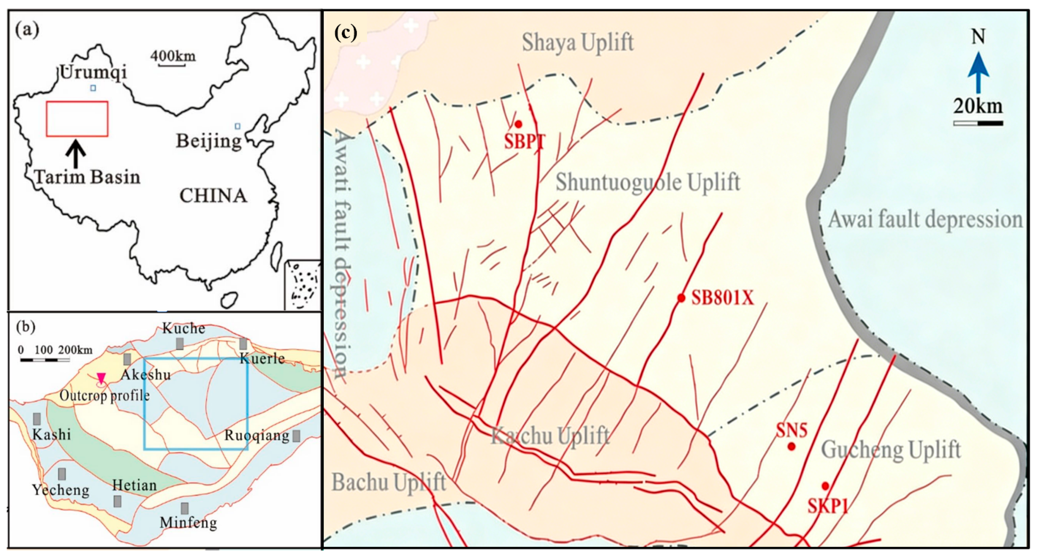 - Xiong, R.; Fu, H.; Li, Y.; Xie, C.; Wang, R.; Zhao, S.; Xu, C.; Xiao, C. Sequence of middle-lower Ordovician in Shunbei area of Tarim Basin, China, and its geological significance. Carbonates Evaporites 2025, 40, 116. [Google Scholar] [CrossRef]
