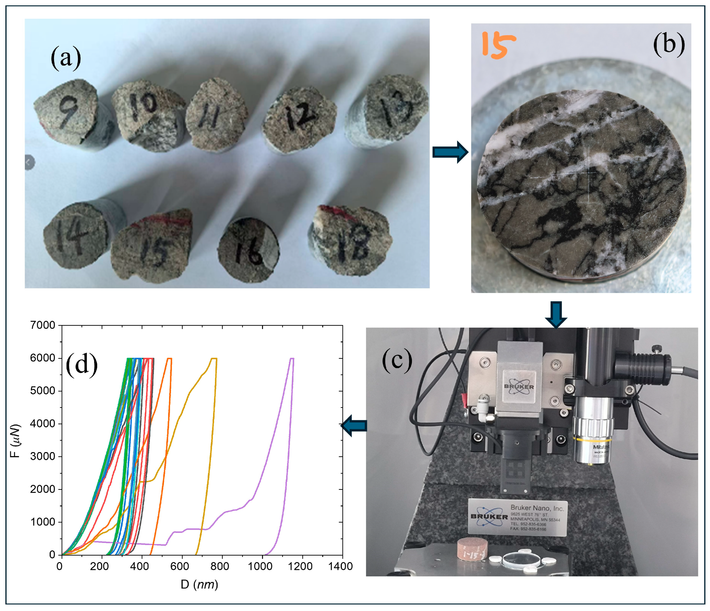 - Deng, T.; Zhao, J.; Yin, H.; Xie, Q.; Gou, L. Mechanical Characterization of Main Minerals in Carbonate Rock at the Micro Scale Based on Nanoindentation. Processes 2024, 12, 2727. [Google Scholar] [CrossRef]